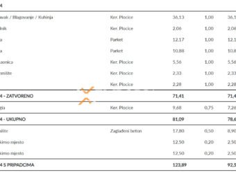 Ovaj se stan, odnosno apartman nalazi na prvom katu stambene zgrade. Ima djelomičan pogled na more. Sastoji se od hodnika, 2 spavaće sobe, kupaonice, wc-a, ostave, kuhinje s blagovaonicom i dnevnim boravkom te lođe. Neto korisna površina navedenog iznosi 78,67 m2.