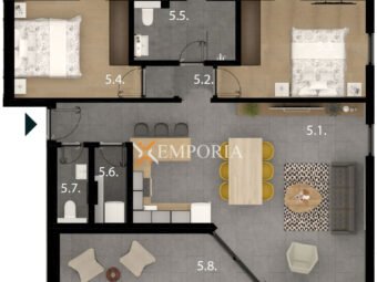 U zgradi se ukupno nalazi 6 stanova. Raspoređeni su na prizemlju, prvom i drugom katu zgrade. Nadalje, gradnja je izvedena betonskim zidom. Krov je izveden ravno što naglašava moderne arhitektonske linije objekta. Prozori su aluminijski s električnim roletama i troslojnim staklom. Osim toga, fasada ima termoizolaciju 10 cm. U stanu su se za oblaganje poda koristili parketi i pločice. Klima uređaji su postavljeni u dnevnom boravku i spavaćim sobama. Dakle, ugrađena su ukupno 3 uređaja za grijanje i hlađenje prostorija. Uz to je u svim prostorijama osim spavaćih soba provedeno podno grijanje na struju. Na kraju, ulazna vrata stana su protuprovalna i protupožarna.