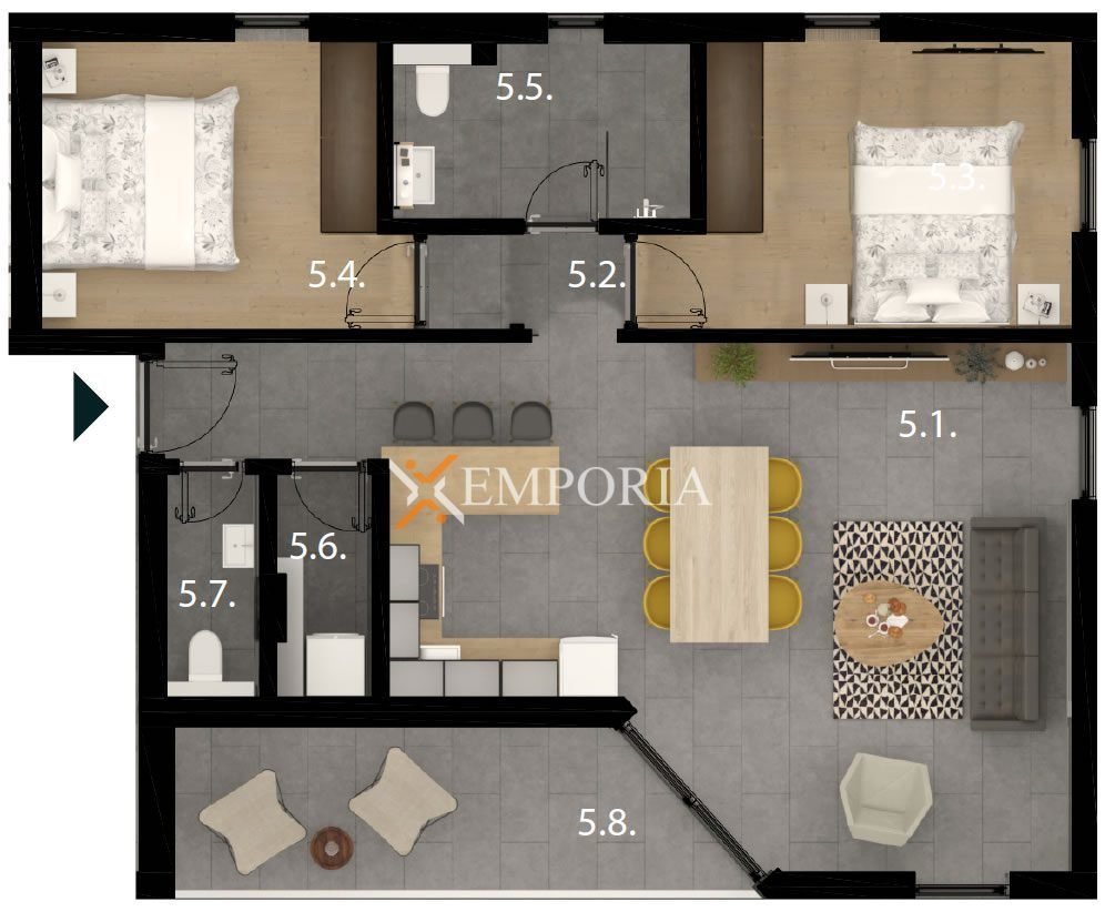 Ovaj se stan, odnosno apartman nalazi na drugom katu stambene zgrade. Ima jako lijep pogled na more. Sastoji se od hodnika, 2 spavaće sobe, kupaonice, wc-a, ostave, kuhinje s blagovaonicom i dnevnim boravkom te lođe. Neto korisna površina navedenog iznosi 78,67 m2.