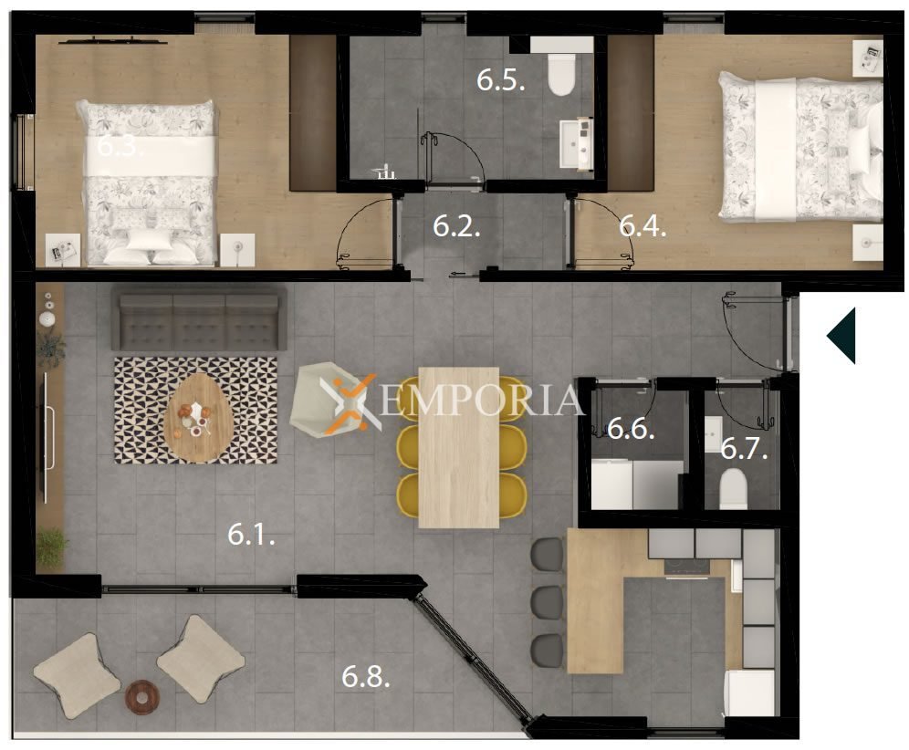 U zgradi se ukupno nalazi 6 stanova. Raspoređeni su na prizemlju, prvom i drugom katu zgrade. Nadalje, gradnja je izvedena betonskim zidom. Krov je izveden ravno što naglašava moderne arhitektonske linije objekta. Prozori su aluminijski s električnim roletama i troslojnim staklom. Osim toga, fasada ima termoizolaciju 10 cm. U stanu su se za oblaganje poda koristili parketi i pločice. Klima uređaji su postavljeni u dnevnom boravku i spavaćim sobama. Dakle, ugrađena su ukupno 3 uređaja za grijanje i hlađenje prostorija. Uz to je u svim prostorijama osim spavaćih soba provedeno podno grijanje na struju. Na kraju, ulazna vrata stana su protuprovalna i protupožarna.