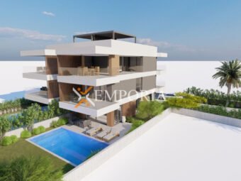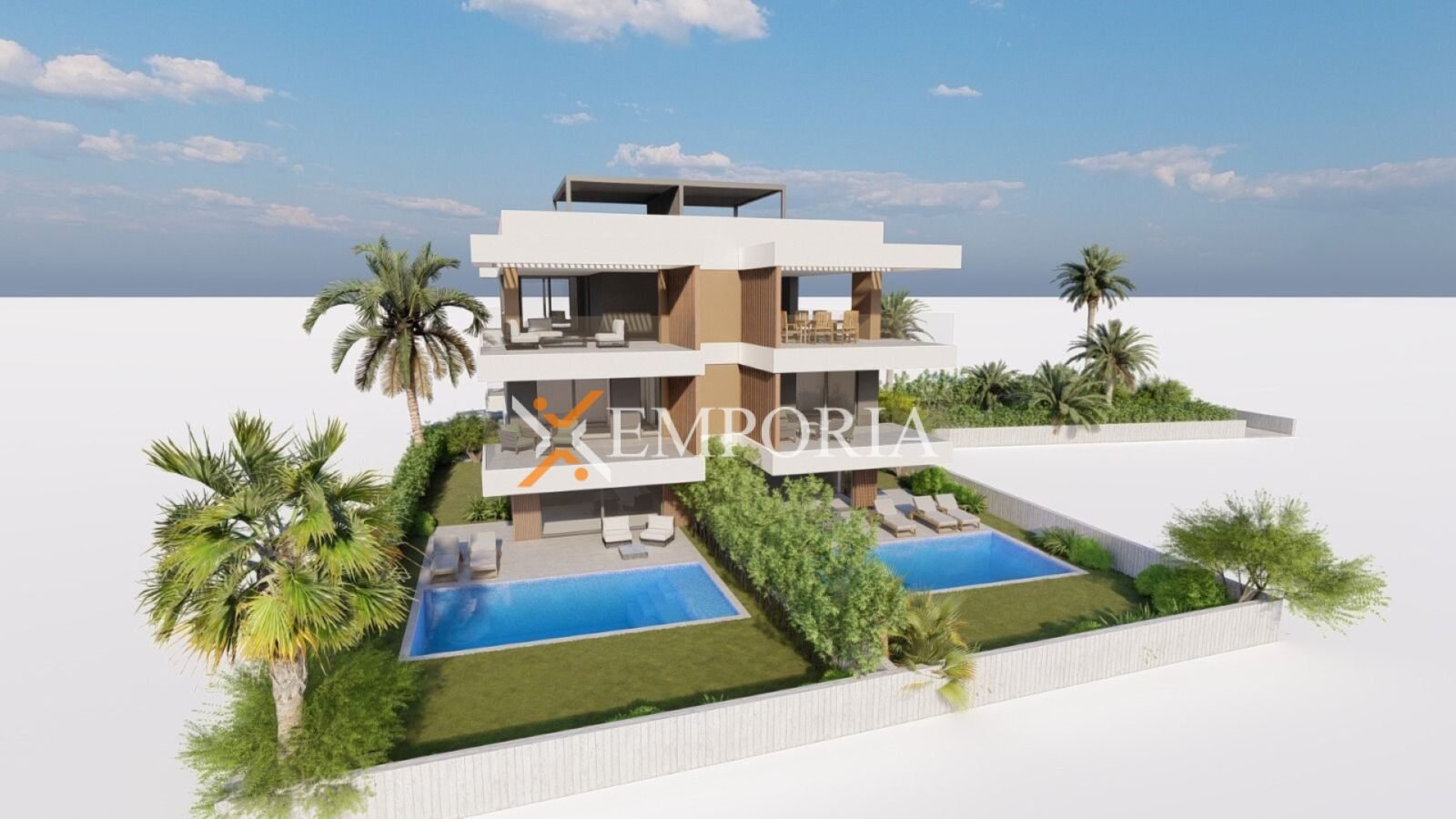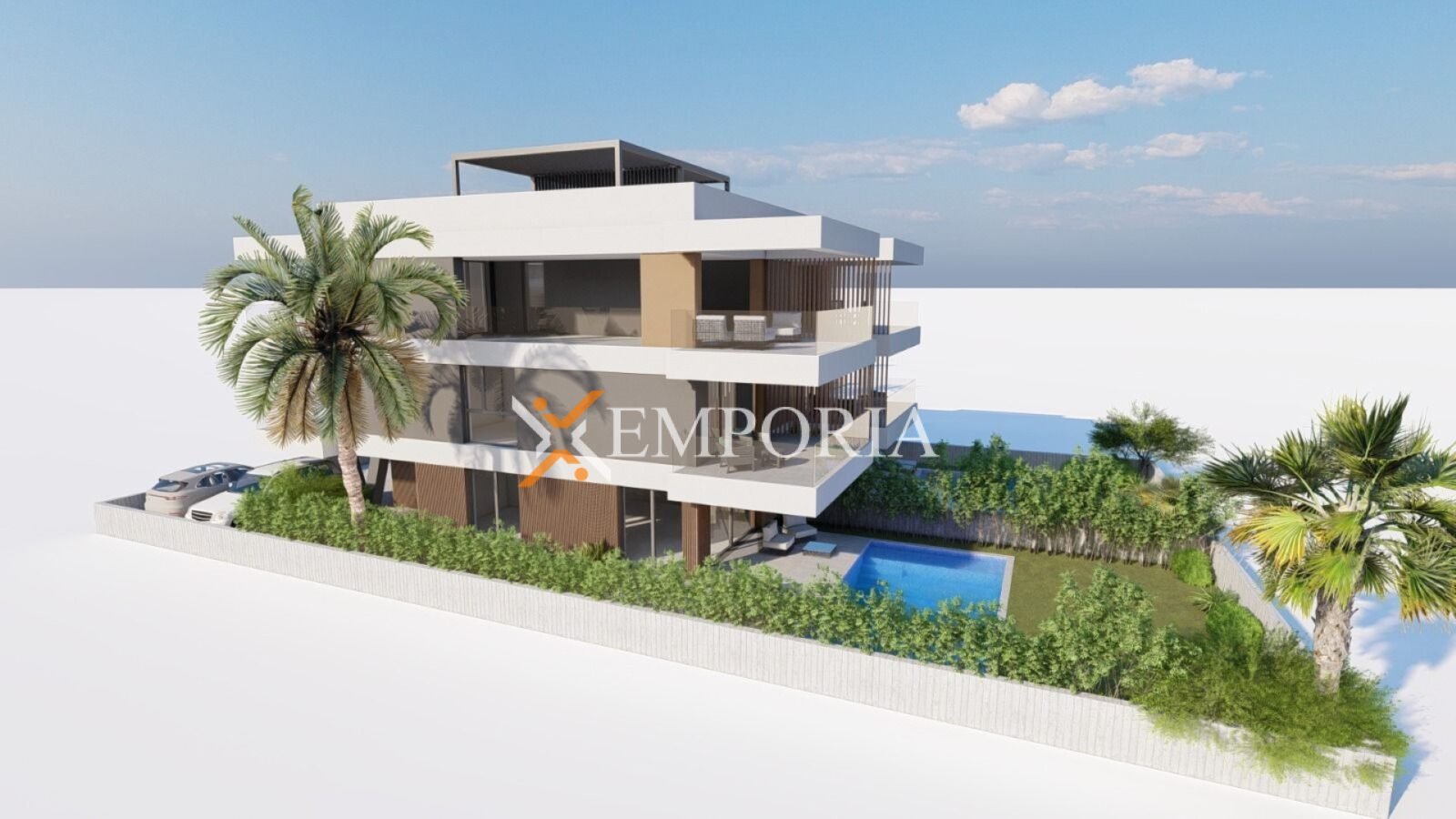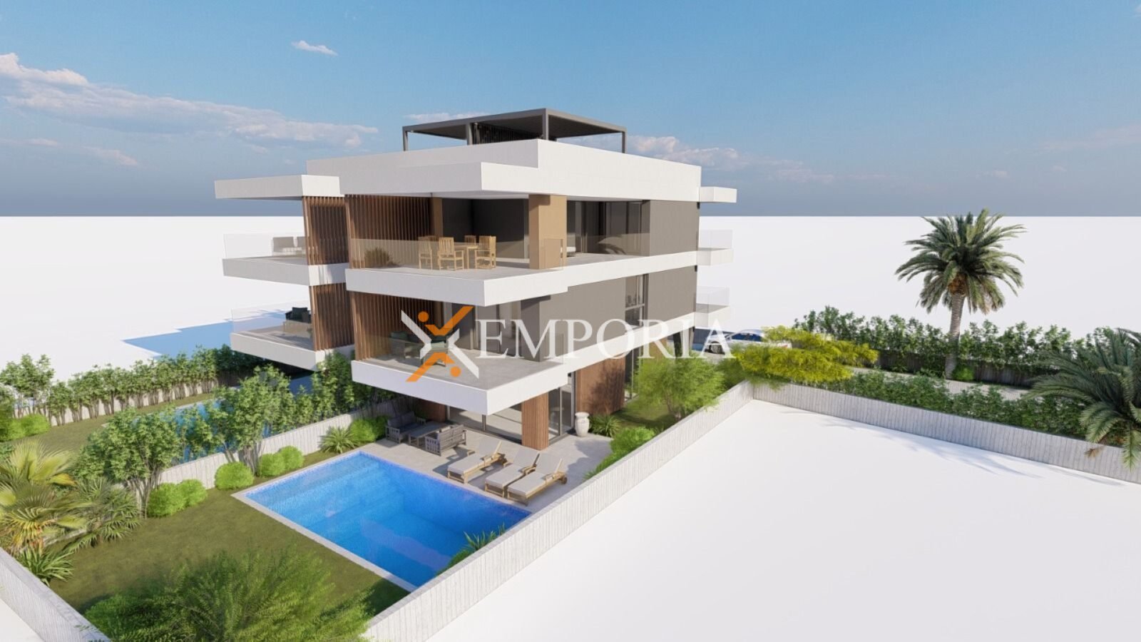Uz zemljište postoji idejni projekt za dvojnu kuću, pri čemu svaka stambena jedinica ima vlastiti bazen. Prizemlje obuhvaća dnevni boravak s kuhinjom i blagovaonicom, toalet, praonicu te djelomično natkrivenu terasu. Na prvom katu nalaze se tri spavaće sobe, dvije kupaonice i dvije natkrivene terase, dok je na drugom katu predviđena dodatna soba i djelomično natkrivena terasa.