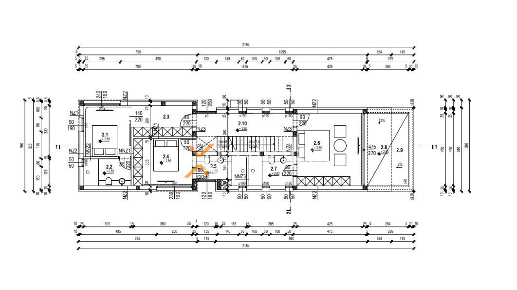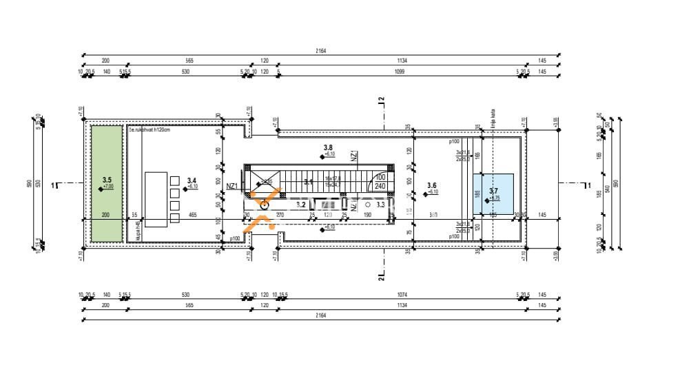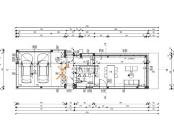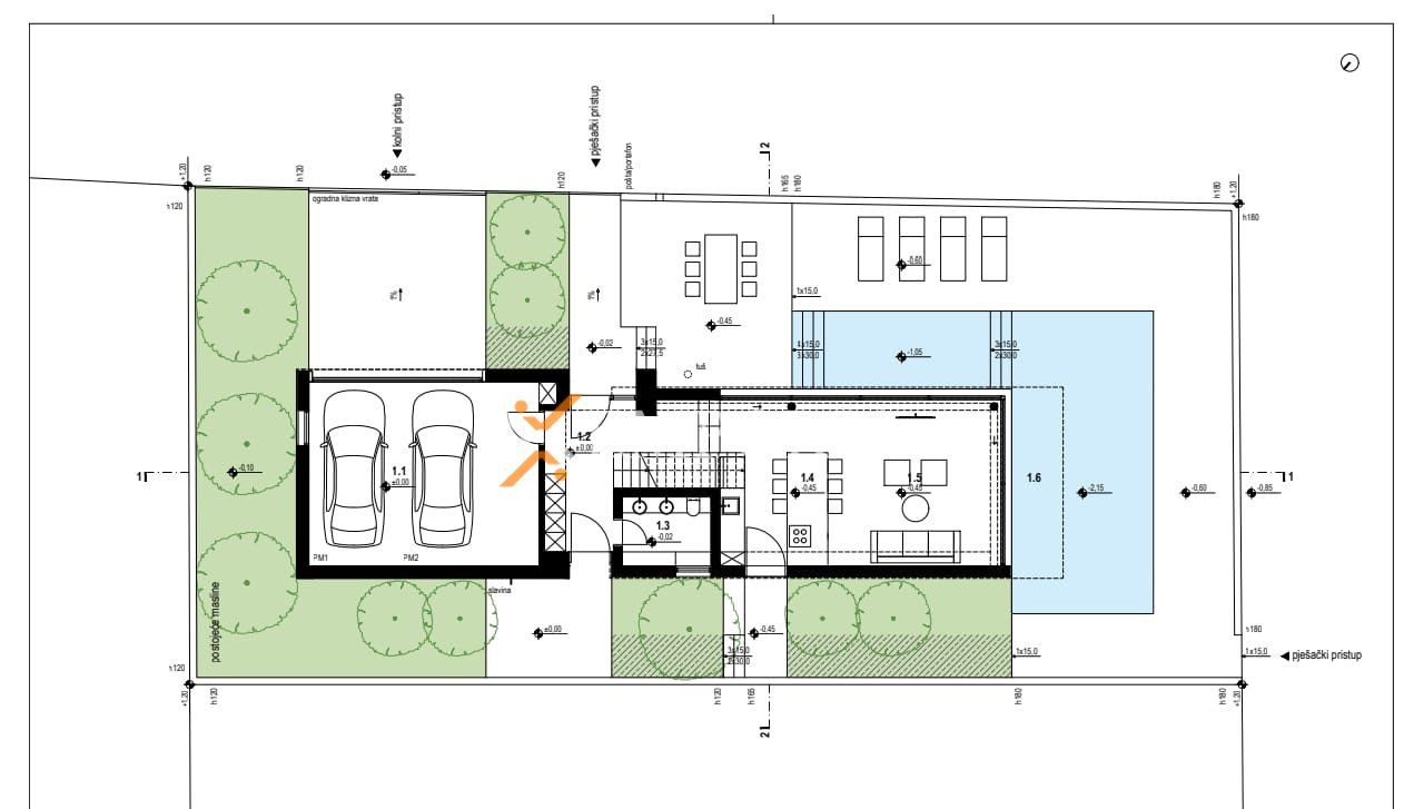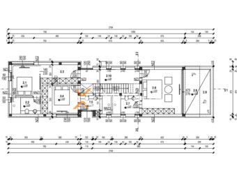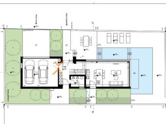 Raspored prostorija u prizemlju (126,40 m2) čine ulaz, kuhinja s blagovaonicom i dnevnim boravkom, WC te garaža. Unutarnje stepenice vode na prvi kat (110,40 m2) gdje se nalaze hodnik, 2 spavaće sobe od kojih svaka ima vlastitu kupaonicu, jedna spavaća soba s kupaonicom i garderobom te dijelom natkrivena terasa. Nadalje, unutarnje stepenice vode na krovnu terasu površine ca. 75 m2.