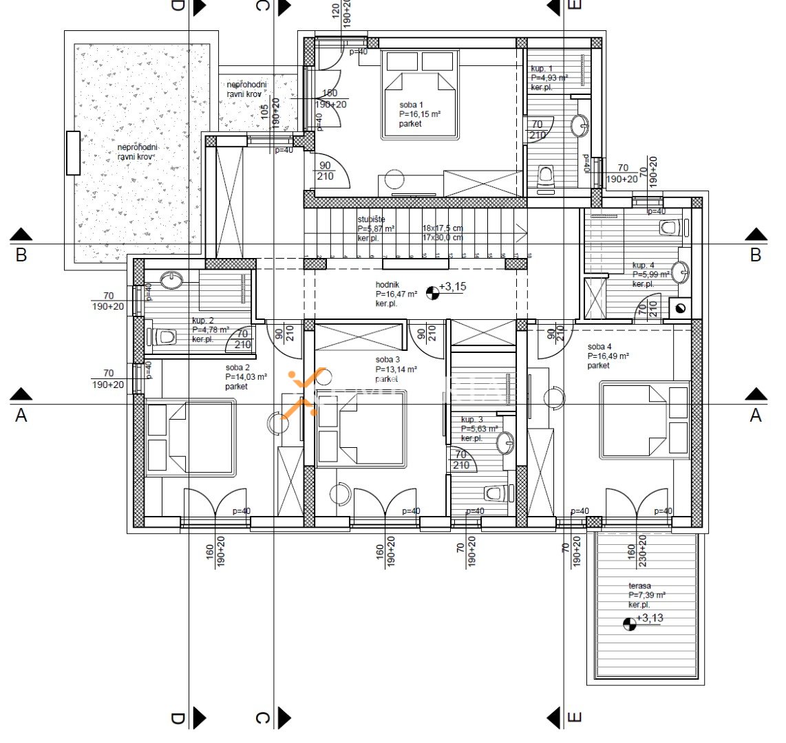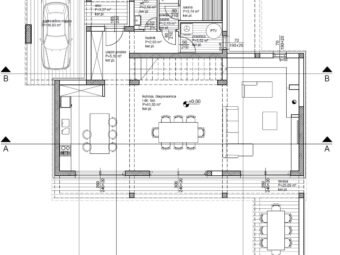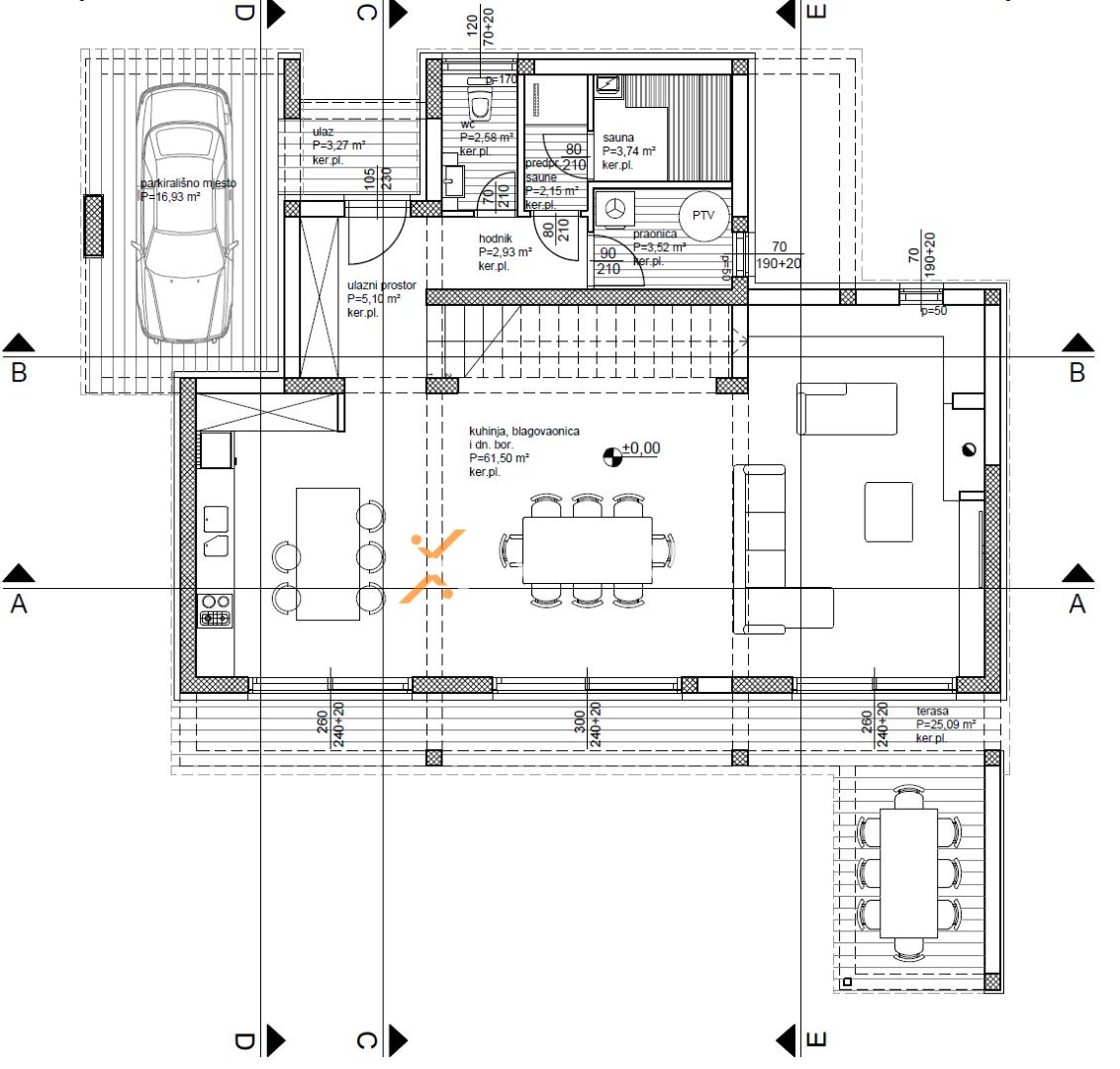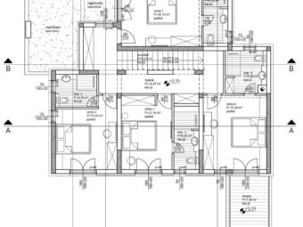 Raspored prostorija čine u prizemlju hodnik, wc, praonica, sauna, kuhinja s blagovaonicom i dnevnim boravkom, terasa i unutarnje stepenice koje vode na prvi kat. Na prvom katu se nalaze hodnik, 4 spavaće sobe, svaka sa svojom kupaonicom, te jedna ima i izlaz na terasu. Unutarnje stepenice vode dalje na krovnu terasu, gdje se nalazi bazen.