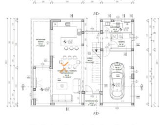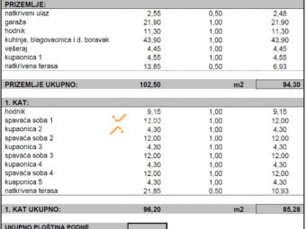 Kuću čine prizemlje i prvi kat. Raspored prostorija u prizemlju čine hodnik, praonica, kupaonica, kuhinja s blagovaonicom i dnevnim boravkom, natkrivena terasa te garaža. Unutarnje stepenice vode na prvi kat gdje se nalazi hodnik, 4 spavaće sobe svaka s kupaonicom te dijelom natkrivena terasa.