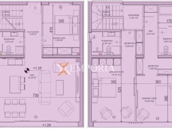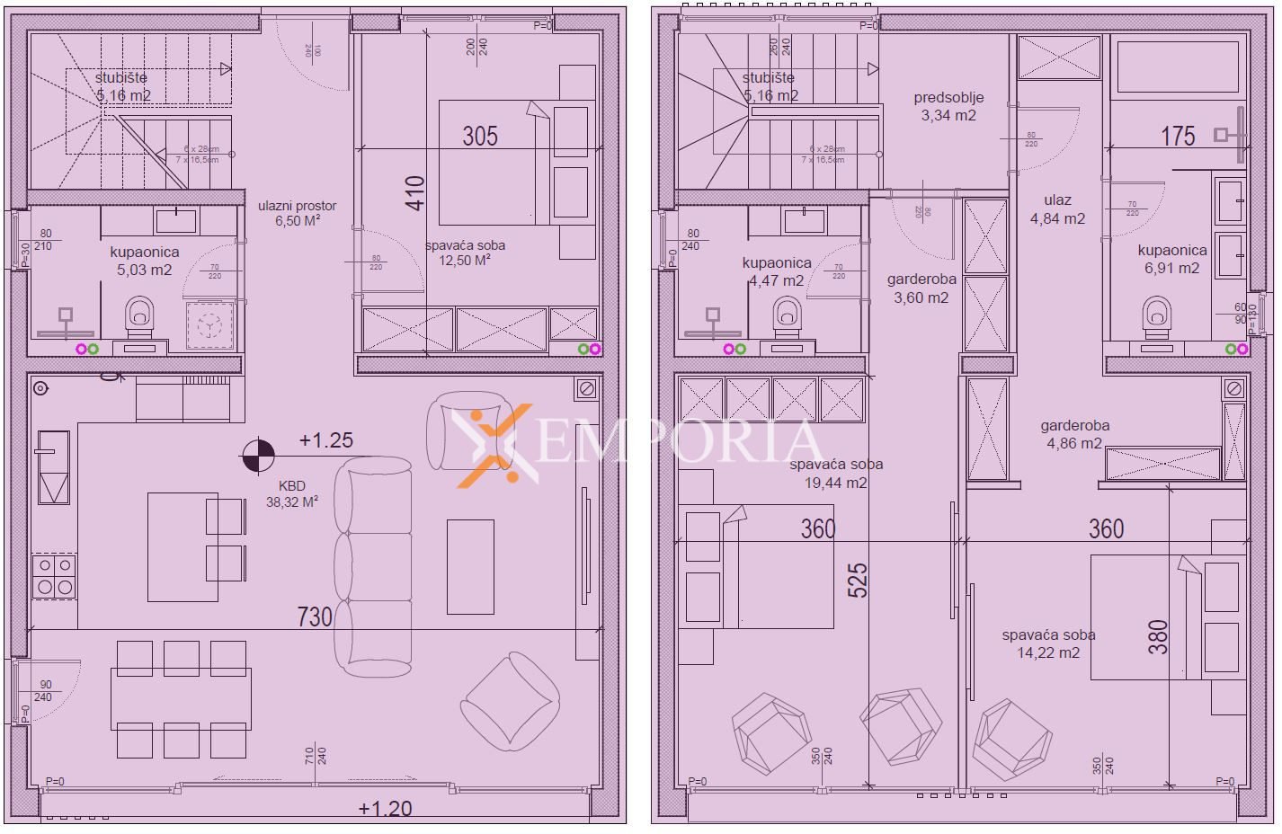 Raspored prostorija čine prizemlje, hodnik, spavaća soba, kupaonica, kuhinja s blagovaonicom i dnevnim boravkom, nenatkrivena terasa. Unutarnjim stepenicama se ide na kat gdje se nalazi hodnik, dvije spavaće sobe, svaka sa kupaonicom i garderobom.