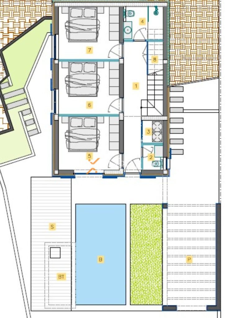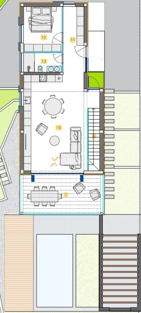 Kuća se sastoji od prizemlja i kata. U prizemlju se nalazi hodnik, WC, praonica, kupaonica i tri spavaće sobe ukupne površine 51,95 m². Vanjski prostor obuhvaća pergolu, sunčalište i bazen površine 18 m². Na katu se smjestio prostran dnevni dio s kuhinjom, blagovaonicom i dnevnim boravkom, garderoba, spavaća soba i kupaonica, ukupne površine 73,74 m², te natkrivena terasa površine 21,45 m². U podrumu se nalazi spremište od 30 m² a kući pripadaju i dva parkirna mjesta.