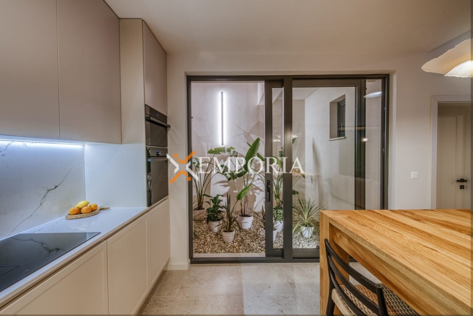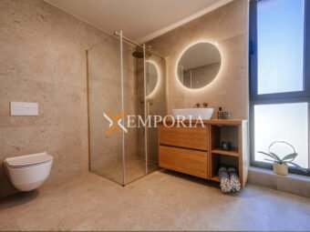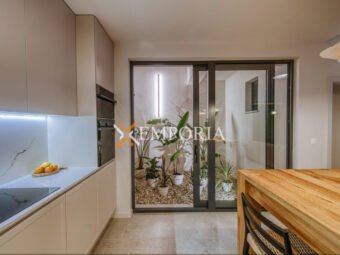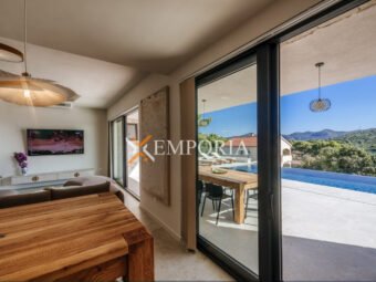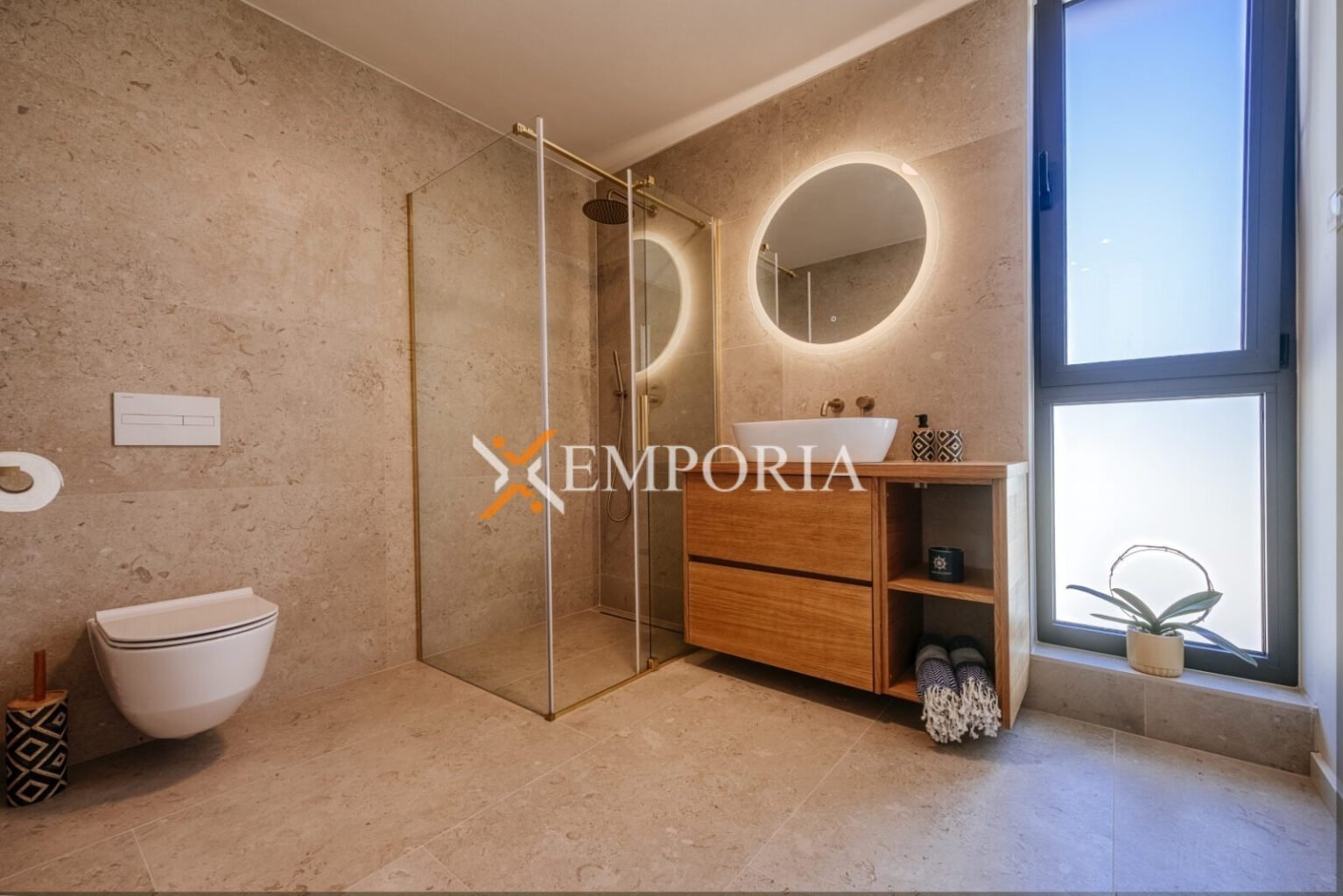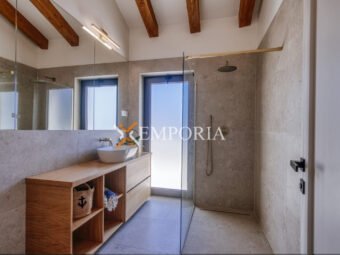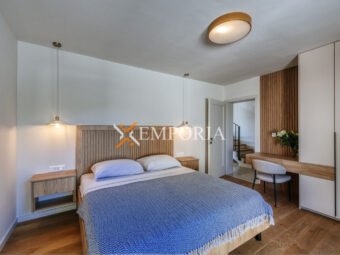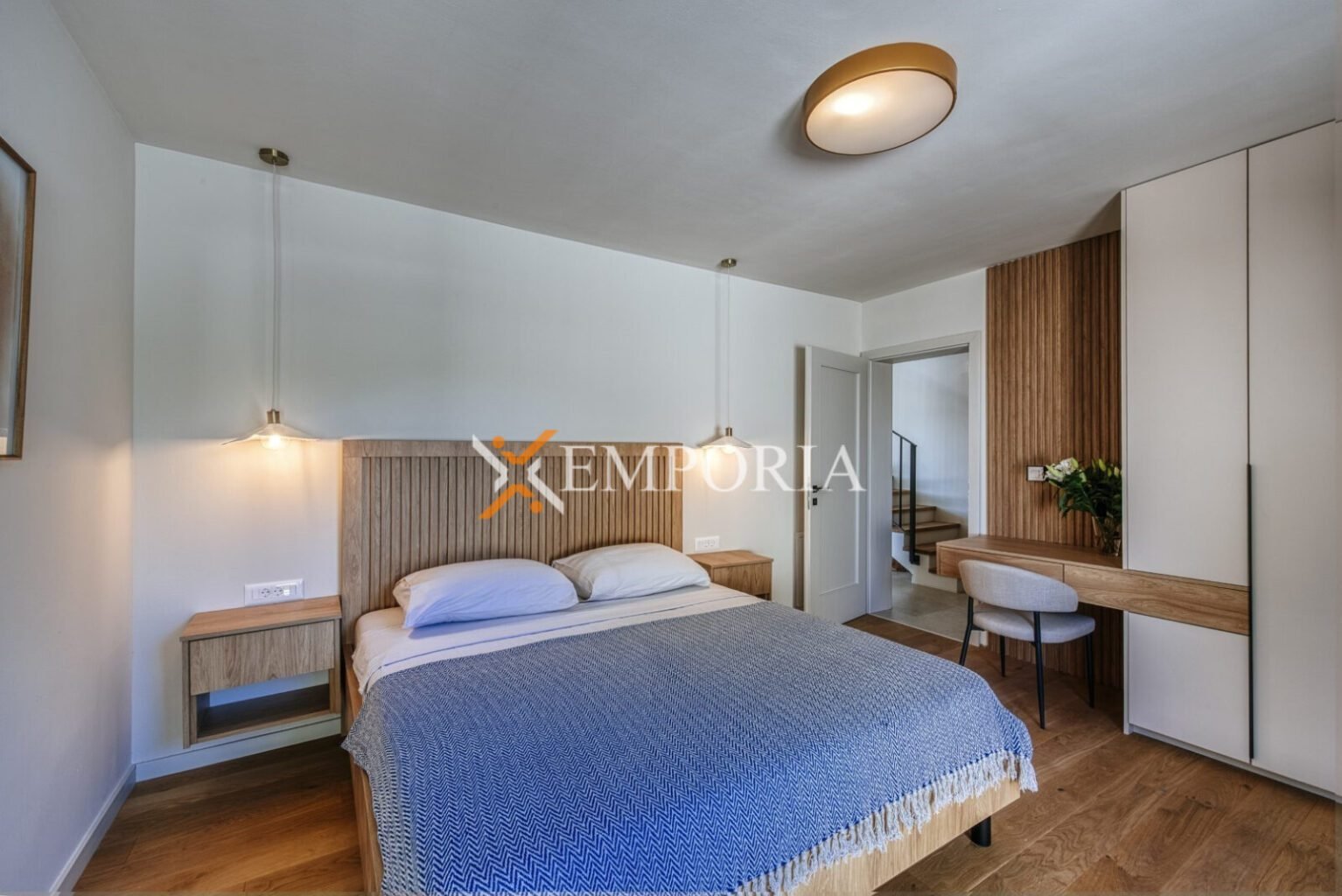 U prizemlju se nalazi prostrana kuhinja povezana s blagovaonicom i dnevnim boravkom, jedna soba, kupaonica, ostava i mali zeleni vrt unutar kuće. Vanjski dio obuhvaća spremište i praonicu, dodatni WC, terasu, lođu, sunčalište i bazen. Na katu su smještene dvije spavaće sobe, jedna s vlastitom kupaonicom, dodatnom kupaonica i dvije terase s pogledom na more. Kući pripada čak pet parkirnih mjesta.