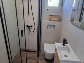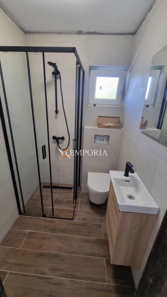 Kuća je opremljena PVC stolarijom s roletama. U svim prostorijama postavljene su keramičke pločice, a svaka stambena jedinica ima vlastiti klima uređaj, ukupno tri. Odvodnja je riješena priključkom na kanalizaciju.