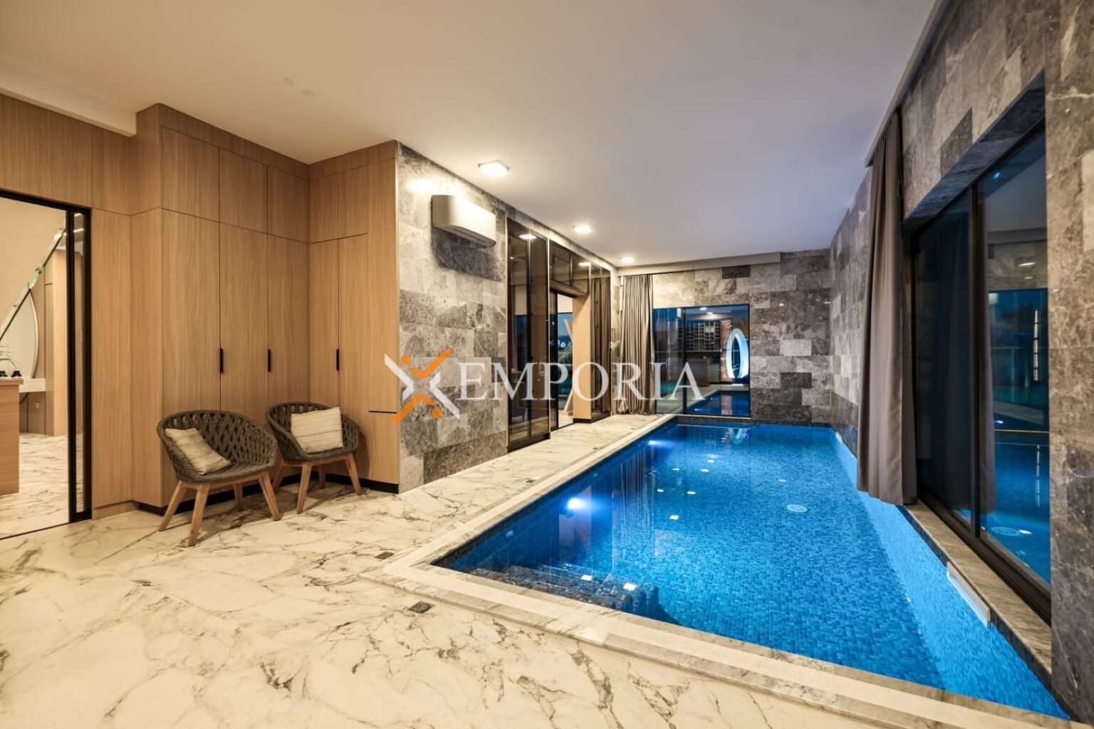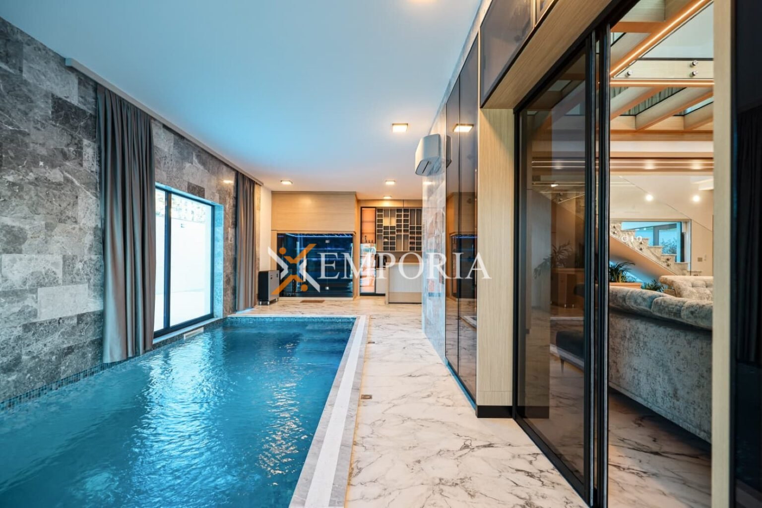 Unutarnji bazen površine 30,47 m² ima keramičku oblogu, grijanje i protustrujno plivanje, dok vanjski bazen od 90 m² također ima grijanje i keramičku oblogu.