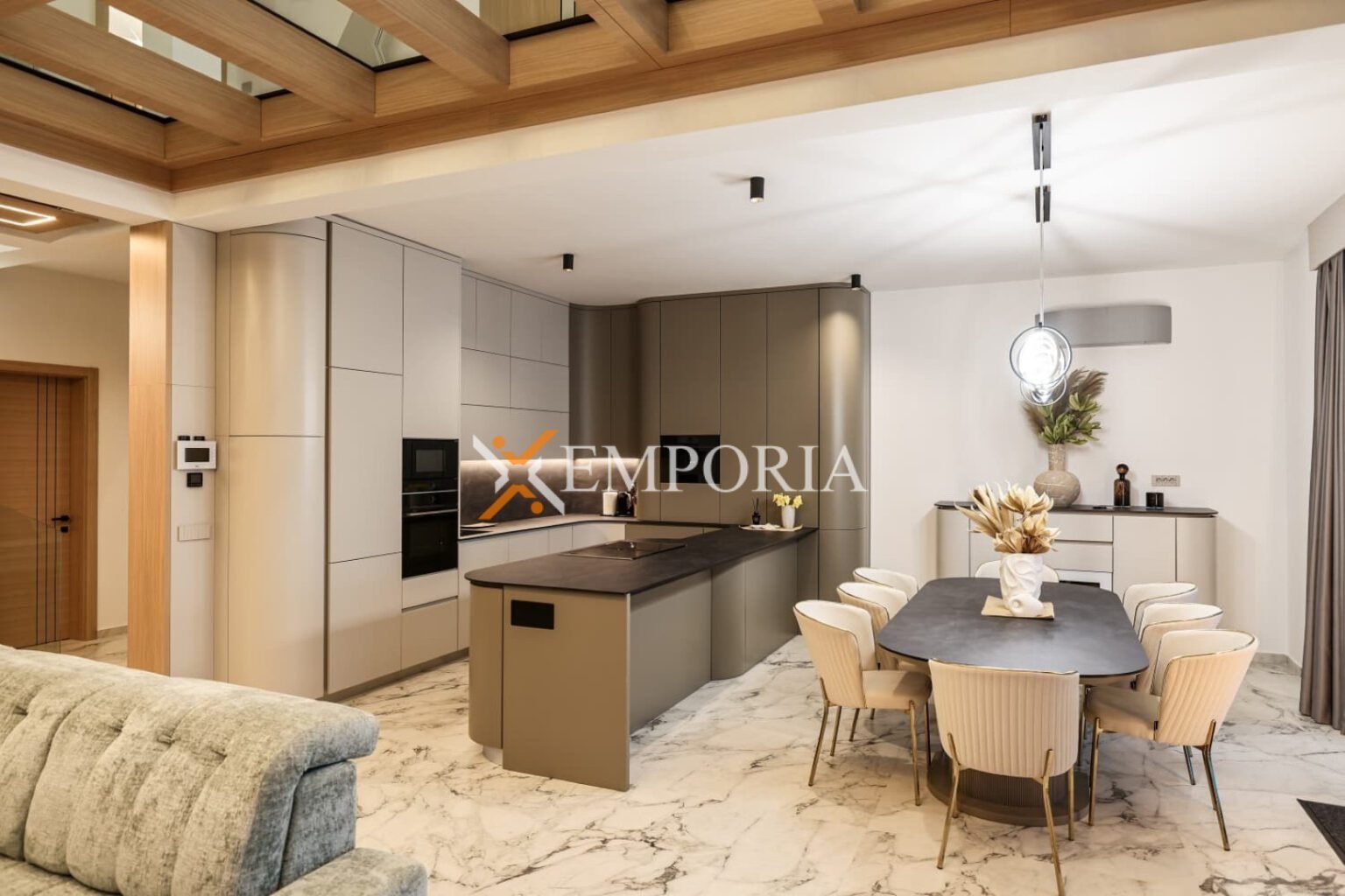 Kućanski aparati su Bosch, kuhinja ima indukcijsku ploču s ugrađenom napom, a sanitarije su Villeroy & Boch i Hans Grohe.