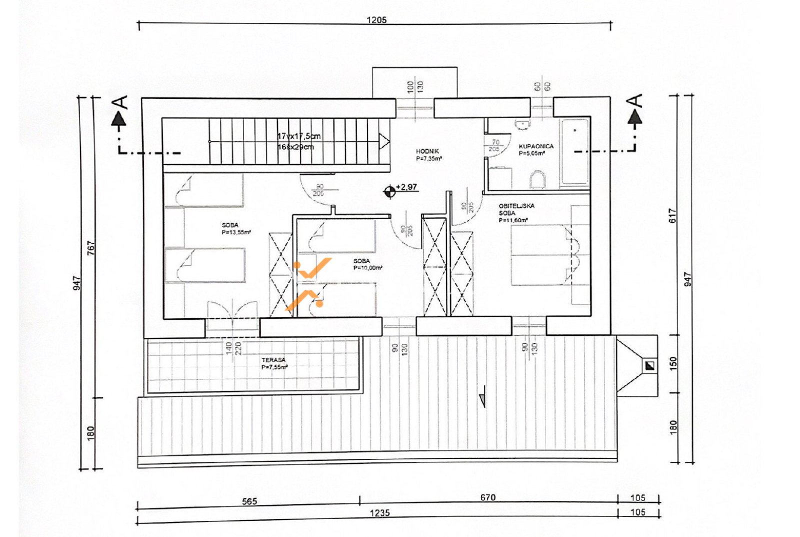 Prizemlje obuhvaća hodnik, kuhinju s blagovaonicom i dnevnim boravkom, kupaonicu, ostavu, unutarnje stubište i terasu, ukupne površine 91,30 m². Na katu se nalaze hodnik, tri spavaće sobe, kupaonica i terasa, ukupne površine 55,10 m².