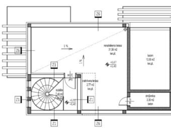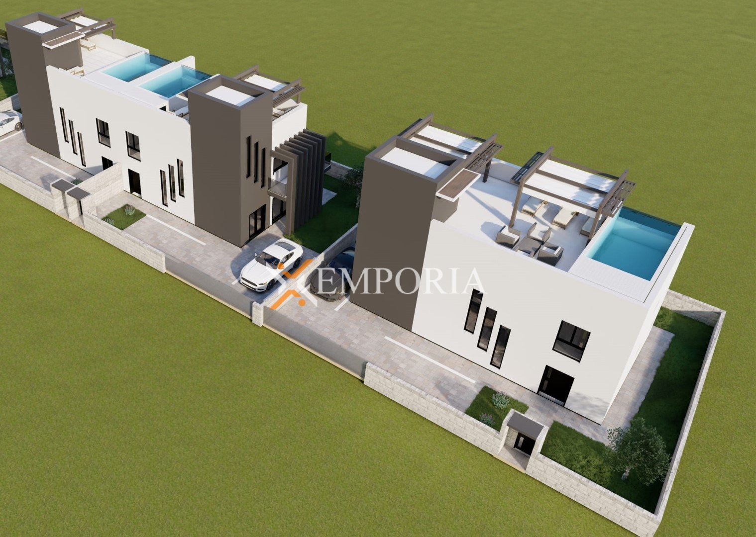 U prizemlju se nalazi dnevni boravak povezan s kuhinjom i blagovaonicom, jedna spavaća soba i kupaonica, dok su na katu smještene dvije spavaće sobe, kupaonica te jedna spavaća soba s vlastitom kupaonicom, uz dvije nenatkrivene terase. Na krovnoj terasi nalazi se kombinacija natkrivenog i nenatkrivenog dijela, kao i bazen sa strojarnicom.