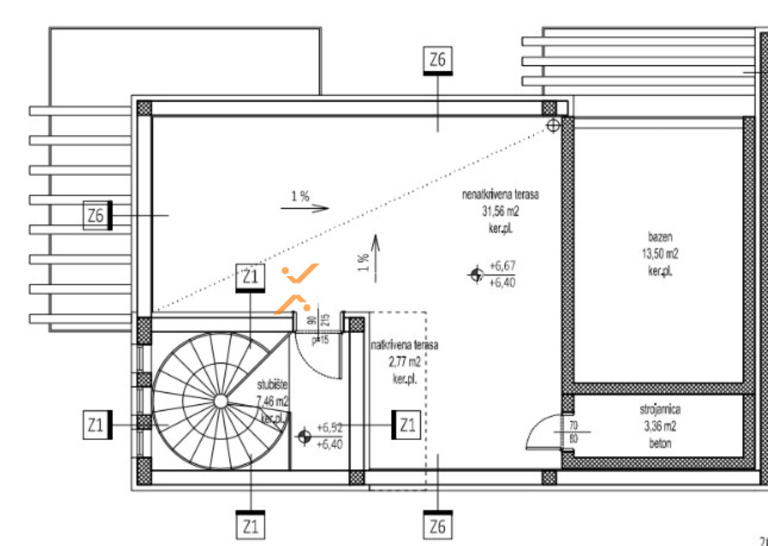 Bazen površine 13,50 m² izveden je u keramici i ima mogućnost grijanja. Kući pripadaju dva parkirna mjesta.