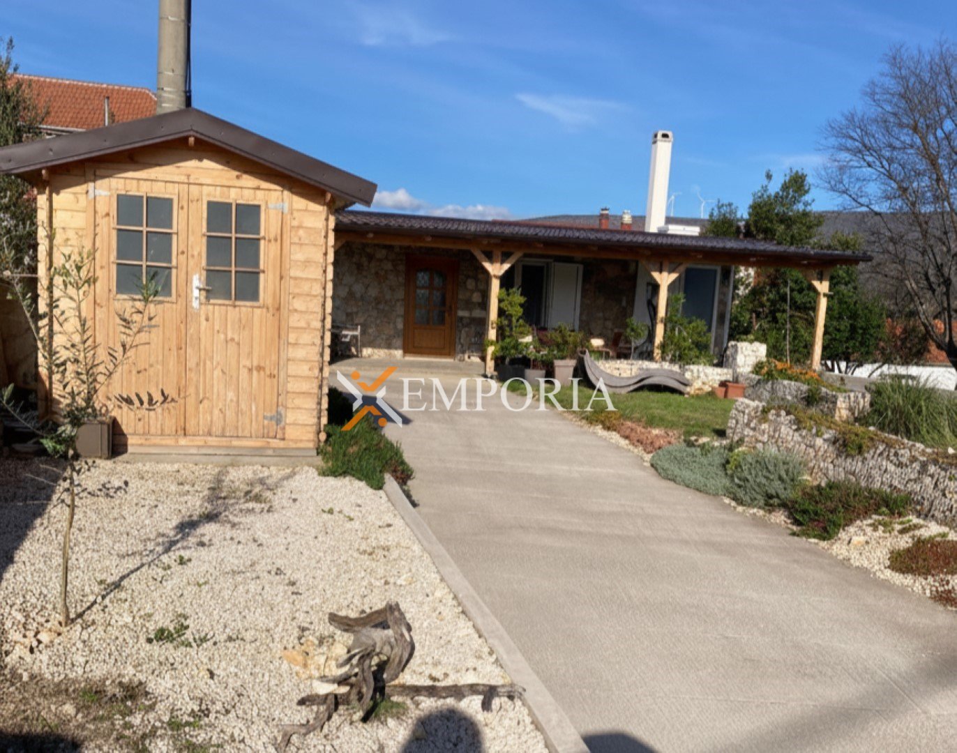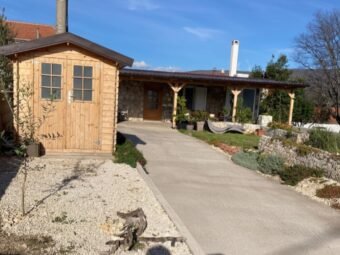Kuća je smještena na zemljištu površine 389 m². Okućnica je uređena i opremljena sustavom navodnjavanja, a u dvorištu se nalazi i dodatna vrtna kućica. Nekretnini pripadaju četiri parkirna mjesta, što osigurava visoku razinu praktičnosti.