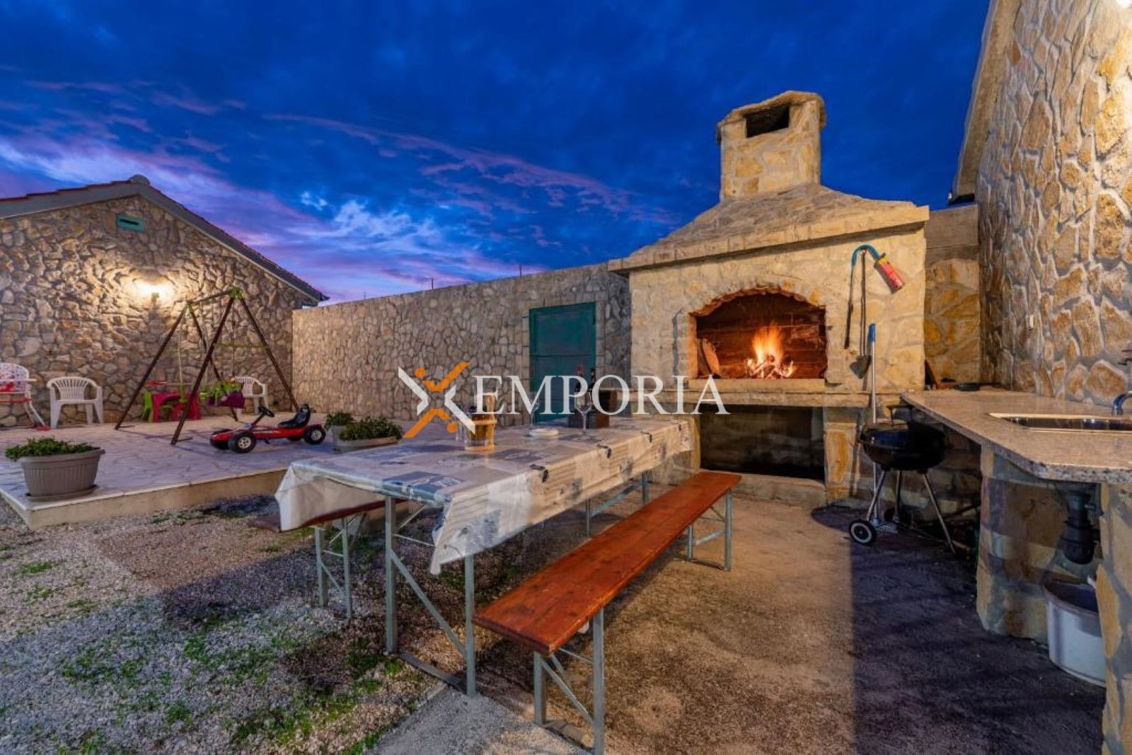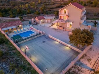 Okućnica je uređena i prostrana, a parkiranje je omogućeno za do 20 vozila unutar dvorišta. Garaža ima površinu 50 m². U dvorištu se nalazi betonski bazen površine 40 m² s pripremom za grijanje, a uz bazen je smješteno nogometno i košarkaško igralište dimenzija 20 m x 13 m. Ukupna površina objekata s bazenom i garažom iznosi 650 m², dok površina zemljišta iznosi 1.600 m².