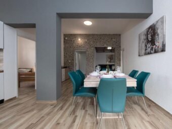 Kuća se prostire na više etaža: podrum, prizemlje, prvi i drugi kat. U podrumu se nalazi konoba s kuhinjom i ostava za vino, ukupne površine oko 48 m², dok je cjelokupni podrum približno 120 m². Prizemlje, prvi i drugi kat čine po jedan trosoban stan, svaki površine oko 120 m². U dvorištu se dodatno nalaze dvije samostojeće kuće, jedna površine 50 m² kao jednosoban apartman te druga od 30 m² uređena kao studio apartman. Ukupna površina stambenih objekata iznosi približno 560 m².