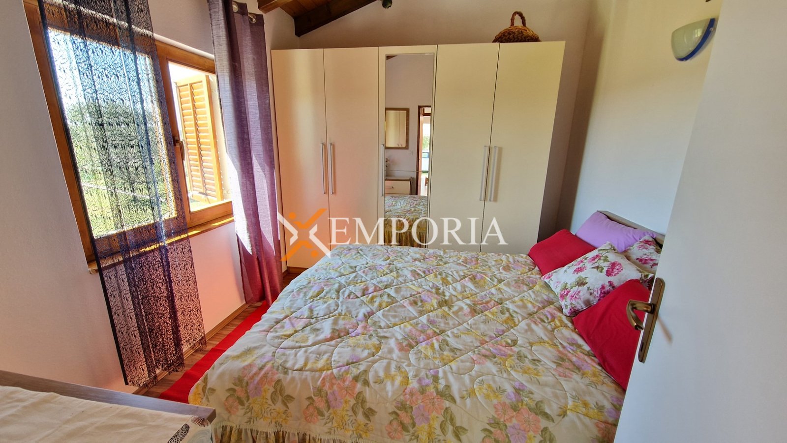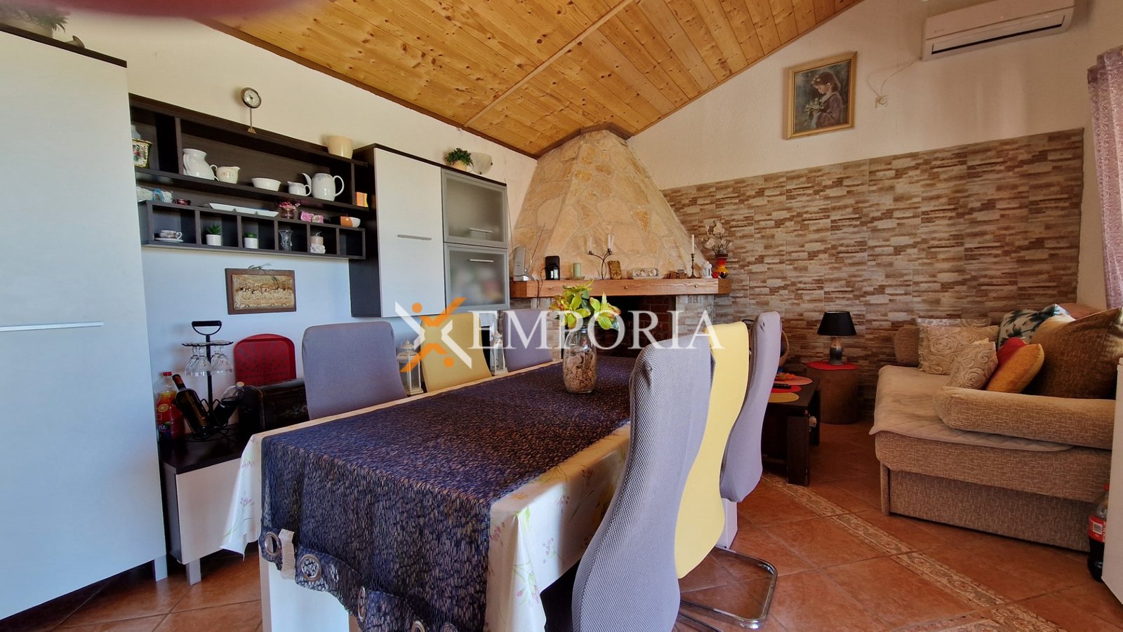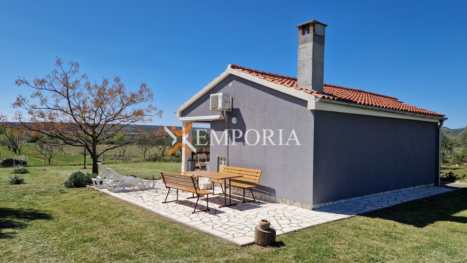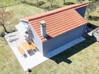 Kuća ima dimnjak i vanjski tuš. Podne obloge čine pločice i laminat.