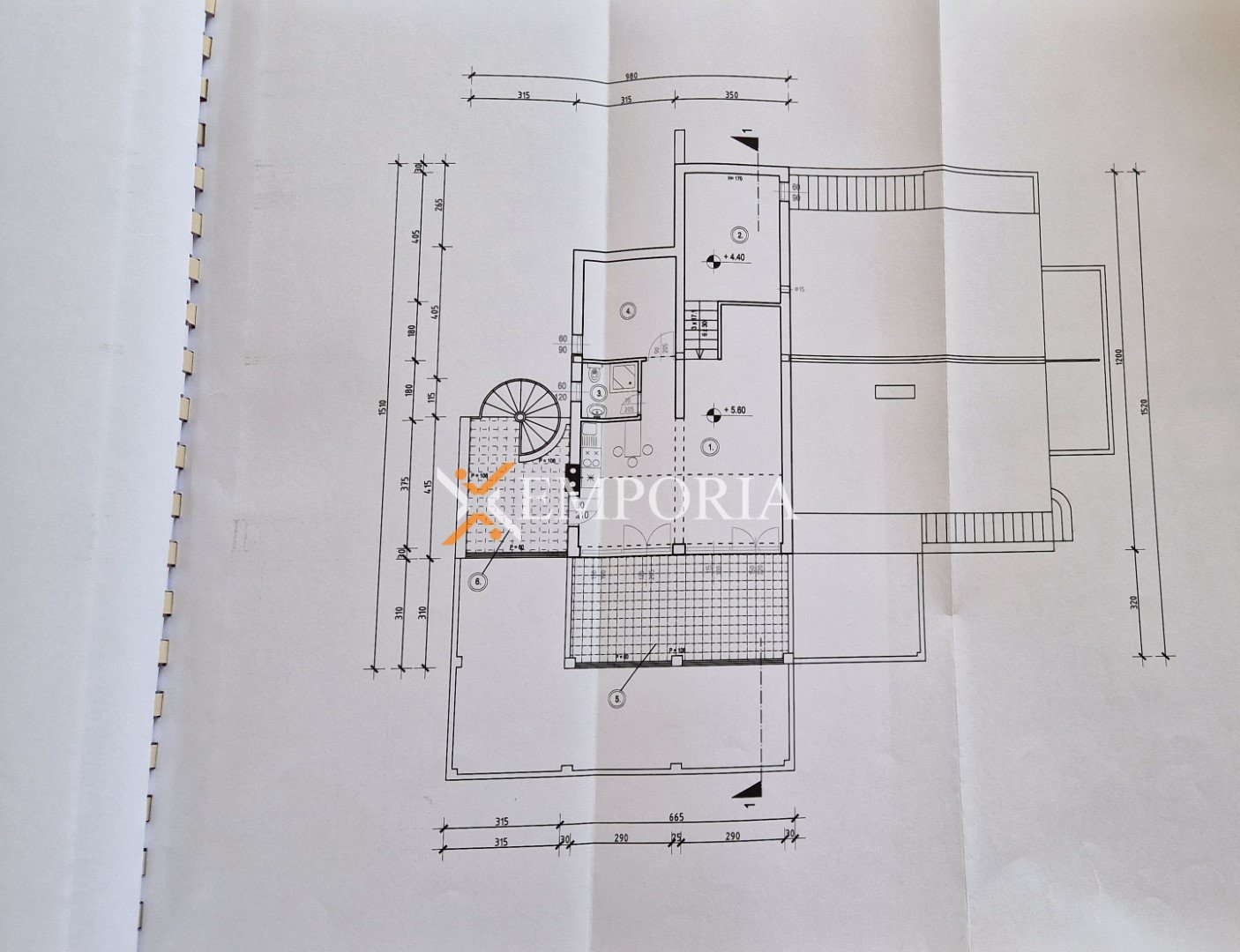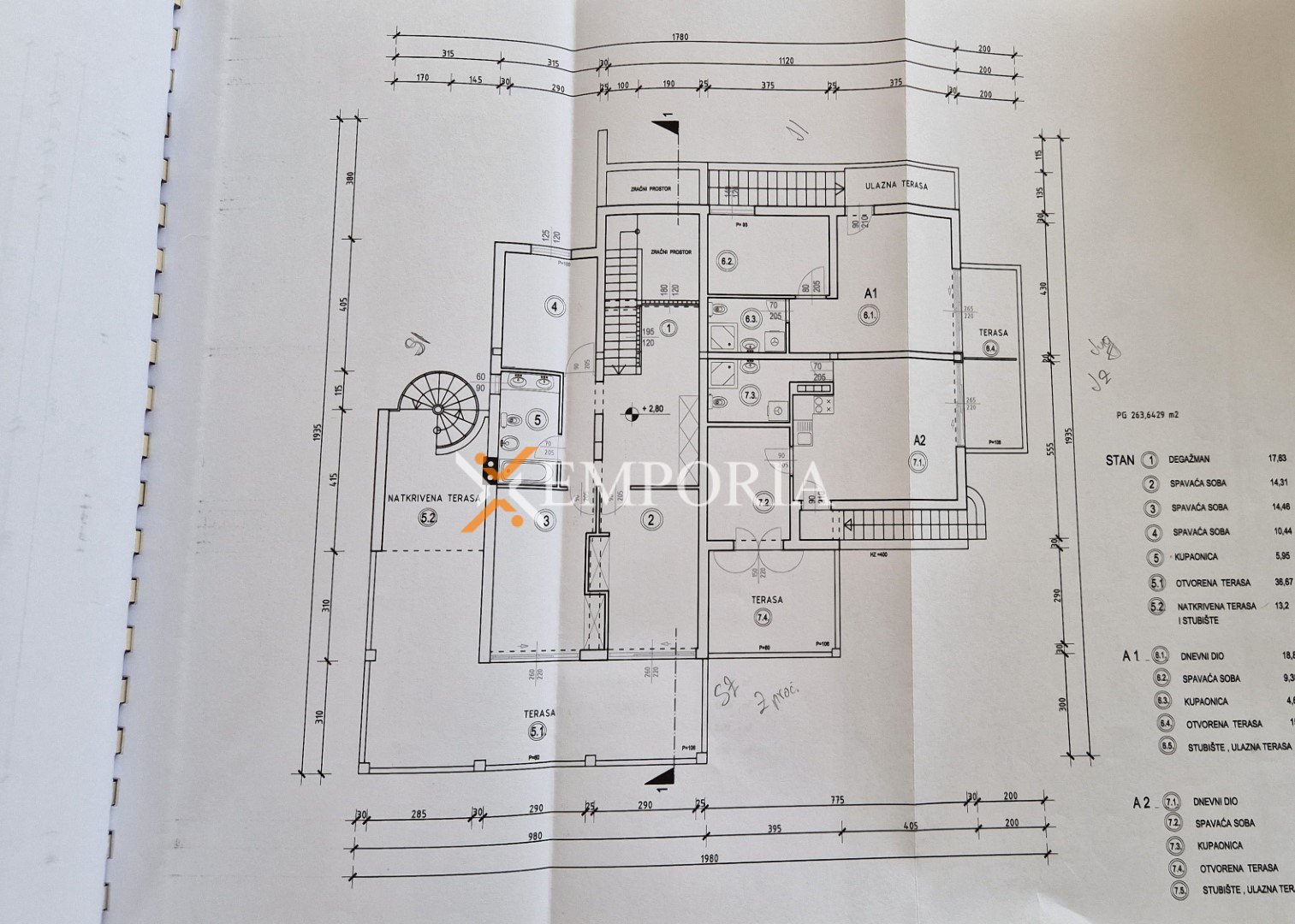 U prizemlju je smješten dvoetažni stan koji obuhvaća četiri spavaće sobe, tri kupaonice, jedan wc, natkrivenu terasu i spremište.