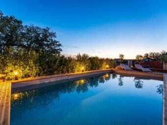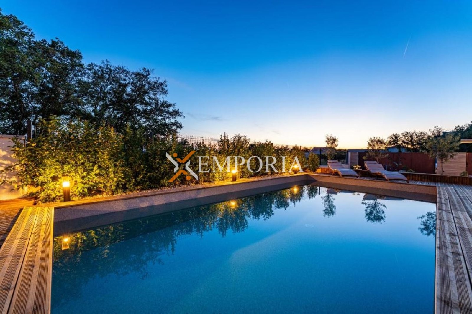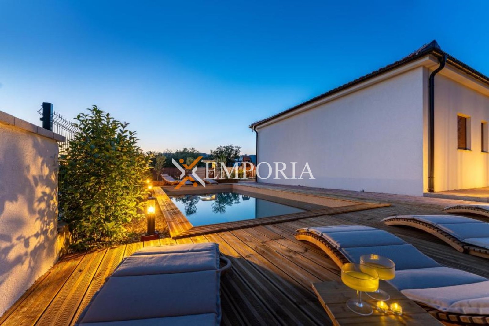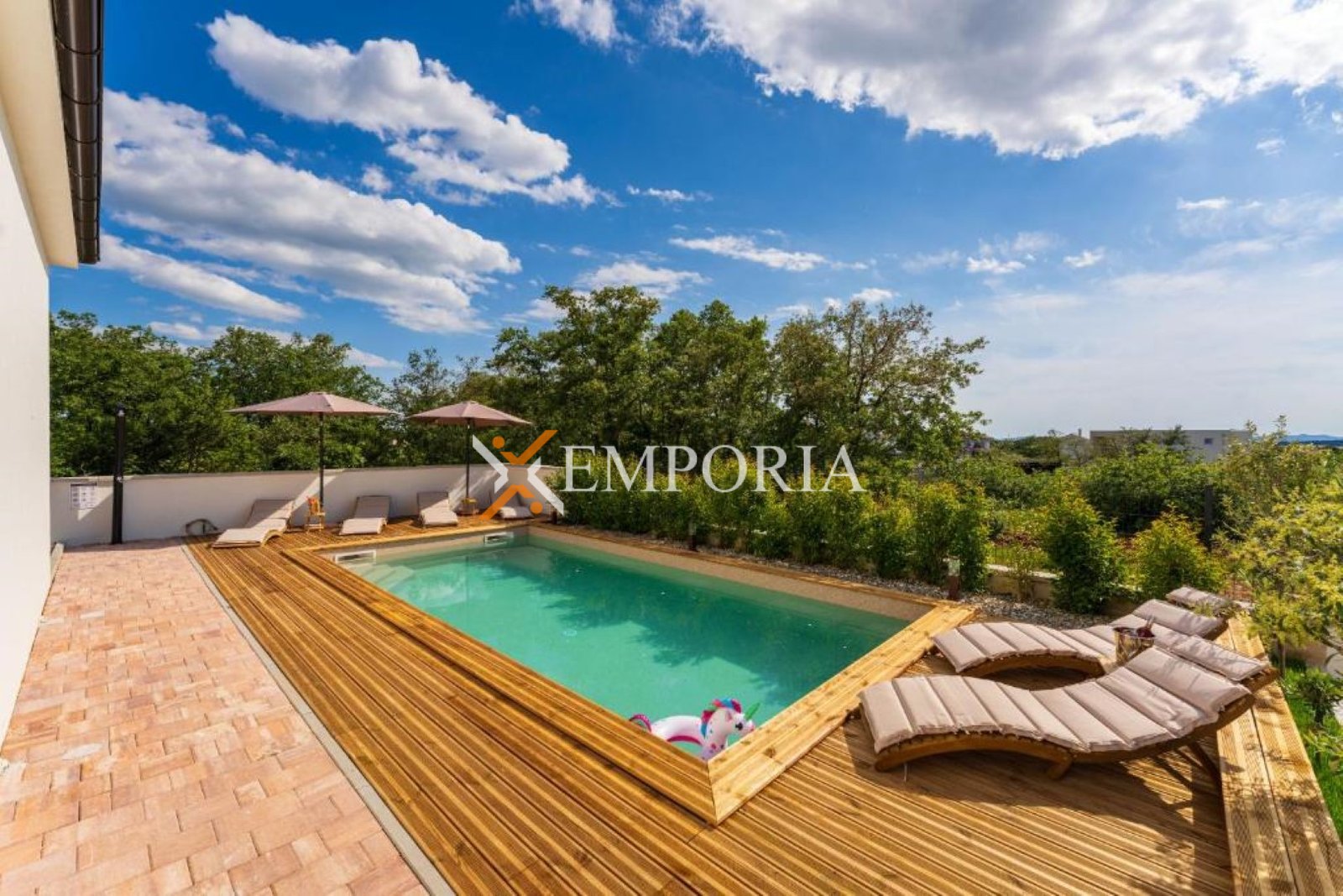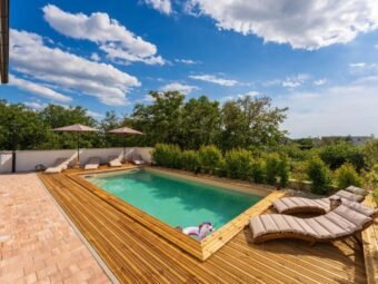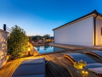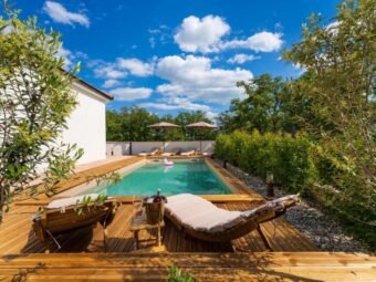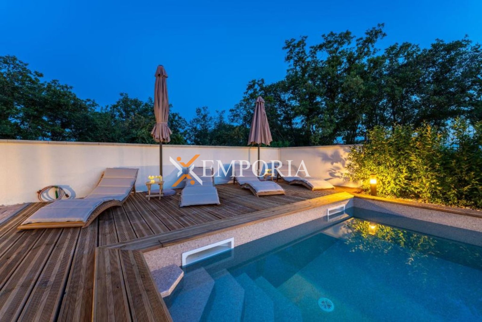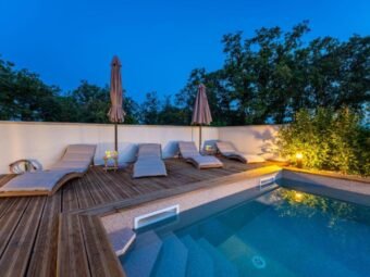 U dvorištu se nalazi bazen površine 32 m2 s folijom. Ukupna površina s bazenom iznosi 156,22 m2, dok površina zemljišta iznosi 615 m2.
