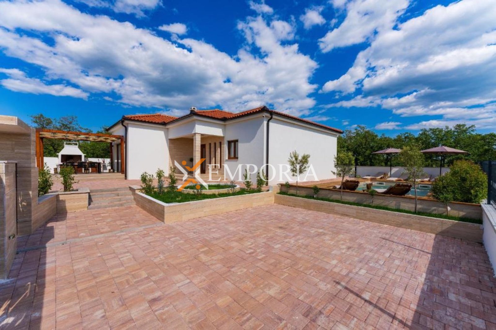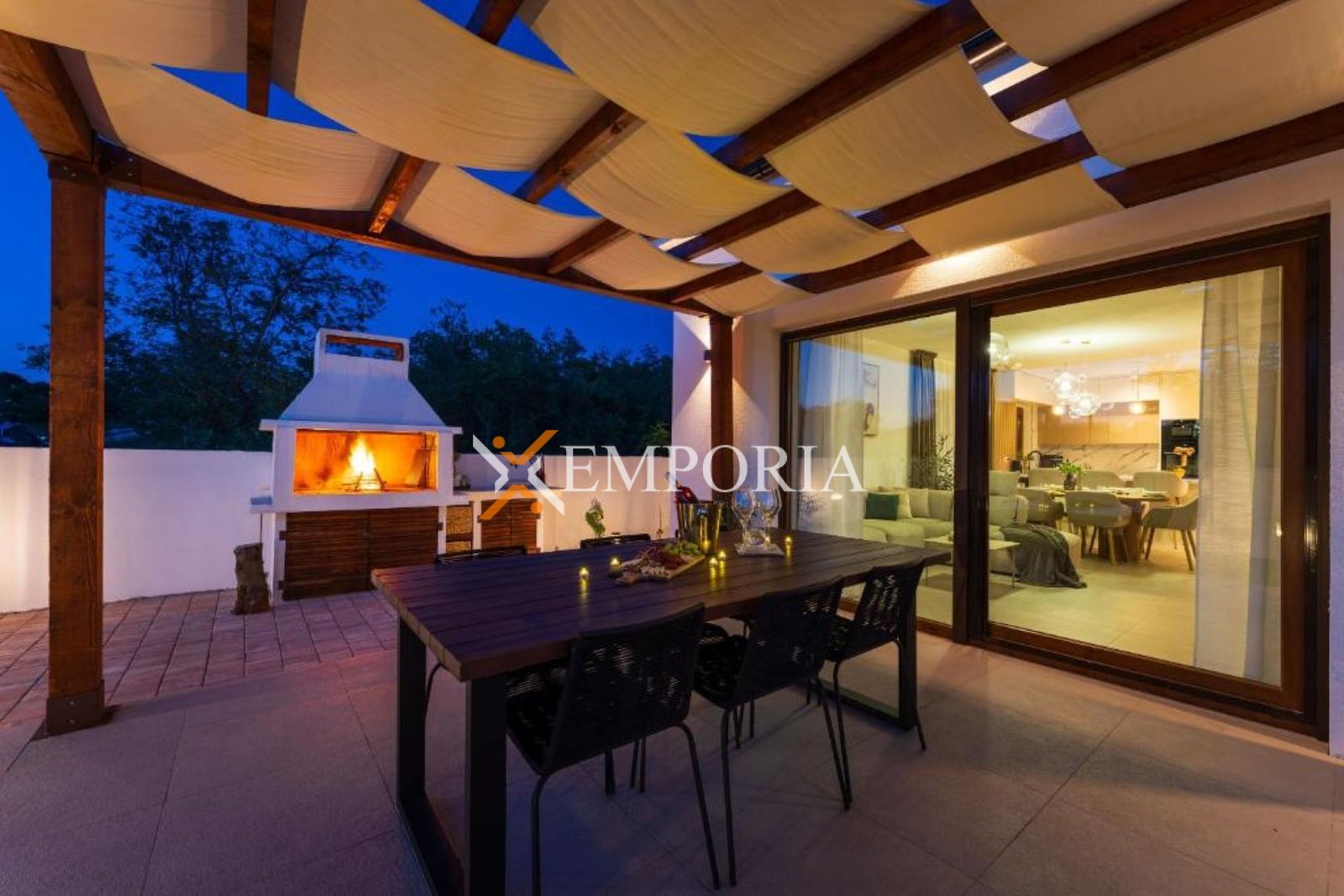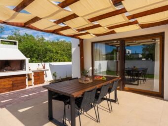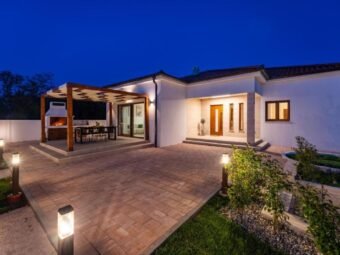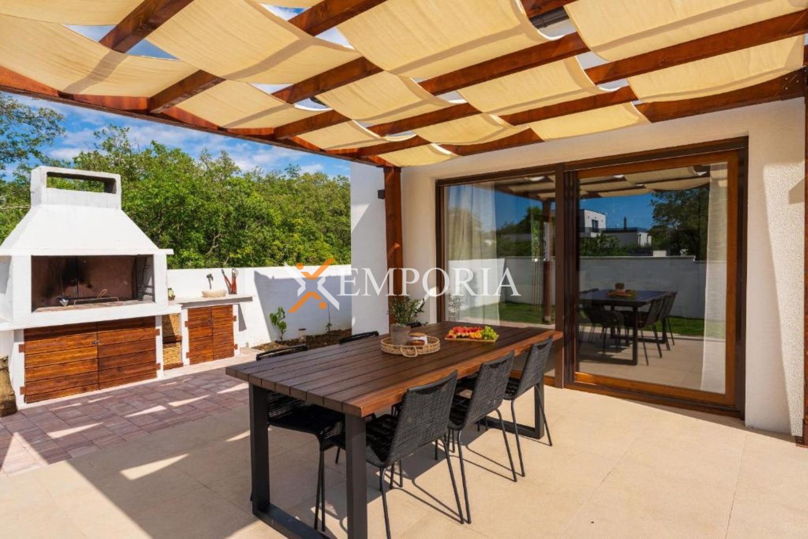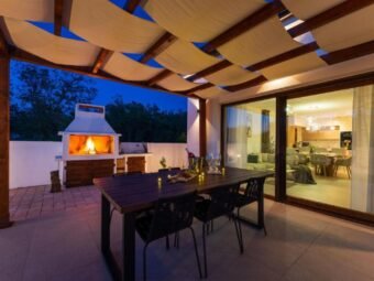 Kuća ima dimnjak i vanjski roštilj.