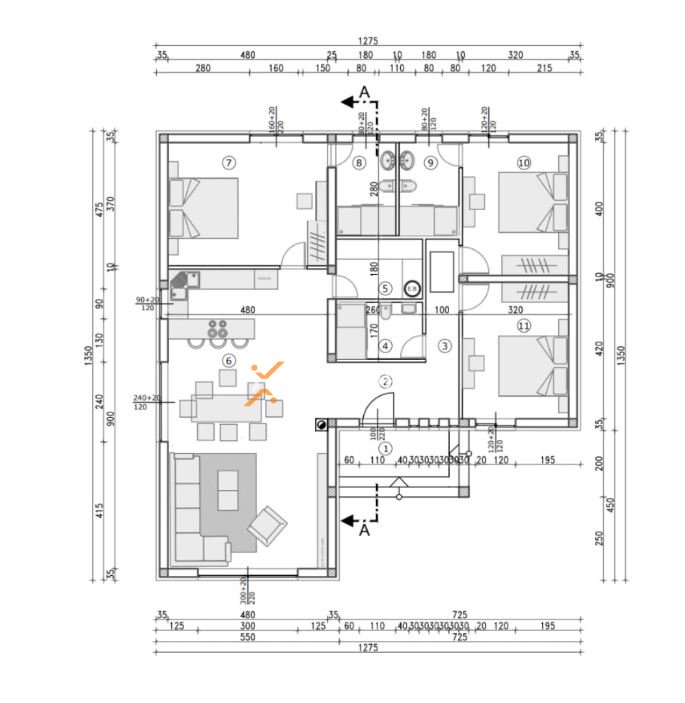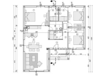Raspored prostorija čine hodnik, spavaća soba, dvije spavaće sobe s kupaonicama, dodatna kupaonica, praonica, kuhinja s blagovaonicom i dnevnim boravkom, natkriveni ulaz te nenatkrivena terasa. Ukupna površina iznosi 124,22 m2.