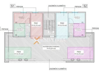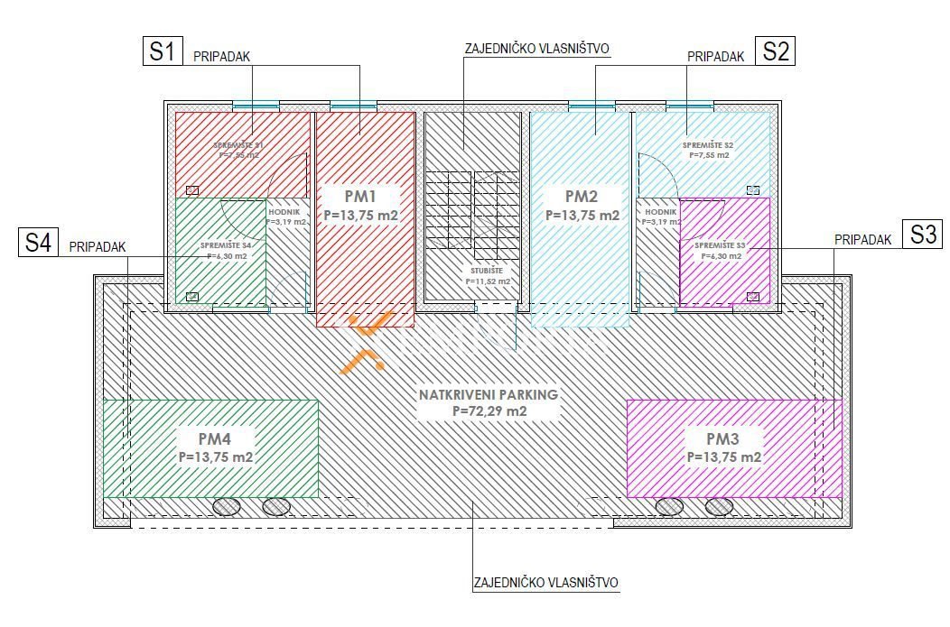 Ovo je dvoetažni stan u prizemlju i na prvom katu. Raspored prostorija u prizemlju čine hodnik, spavaća soba s kupaonicom, wc, kuhinja s blagovaonicom i dnevnim boravkom te lođa. Površina prizemlja iznosi 55,60 m2. Na prvom katu su hodnik, praonica, kupaonica, 2 spavaće sobe, dnevni boravak i lođa. 1. kat ima površinu 46,72 m2. Nadalje stanu pripadaju garažno parkirališno mjesto, vanjsko parkirališno mjesto i spremište u podrumu.
