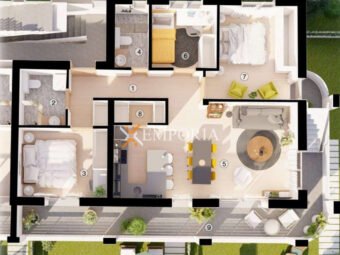 Stan ima jako funkcionalan i lijep raspored. Nalazi se na 2. katu. Sastoji se od hodnika, 3 spavaće sobe, 2 kupaonice, ostave, kuhinje s blagovaonicom i dnevnim boravkom te lođa (92,57 m2). Uz to stanu pripada krovna terasa 81 m2.