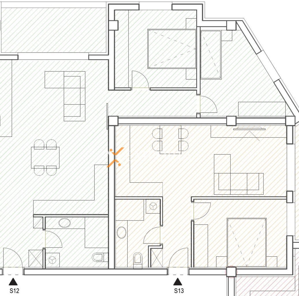 Ovo je penthouse stan na trećem katu s oznakom S12. Tlocrtno se sastoji od hodnika, 2 spavaće sobe, kupaonice, kuhinje s blagovaonicom i dnevnim boravkom te loggie. Površina opisanog je 69,31 m2. Uz stan pripada i krovna terasa od 92,19 m2, parkirno mjesto u garaži i spremište u podrumu.
