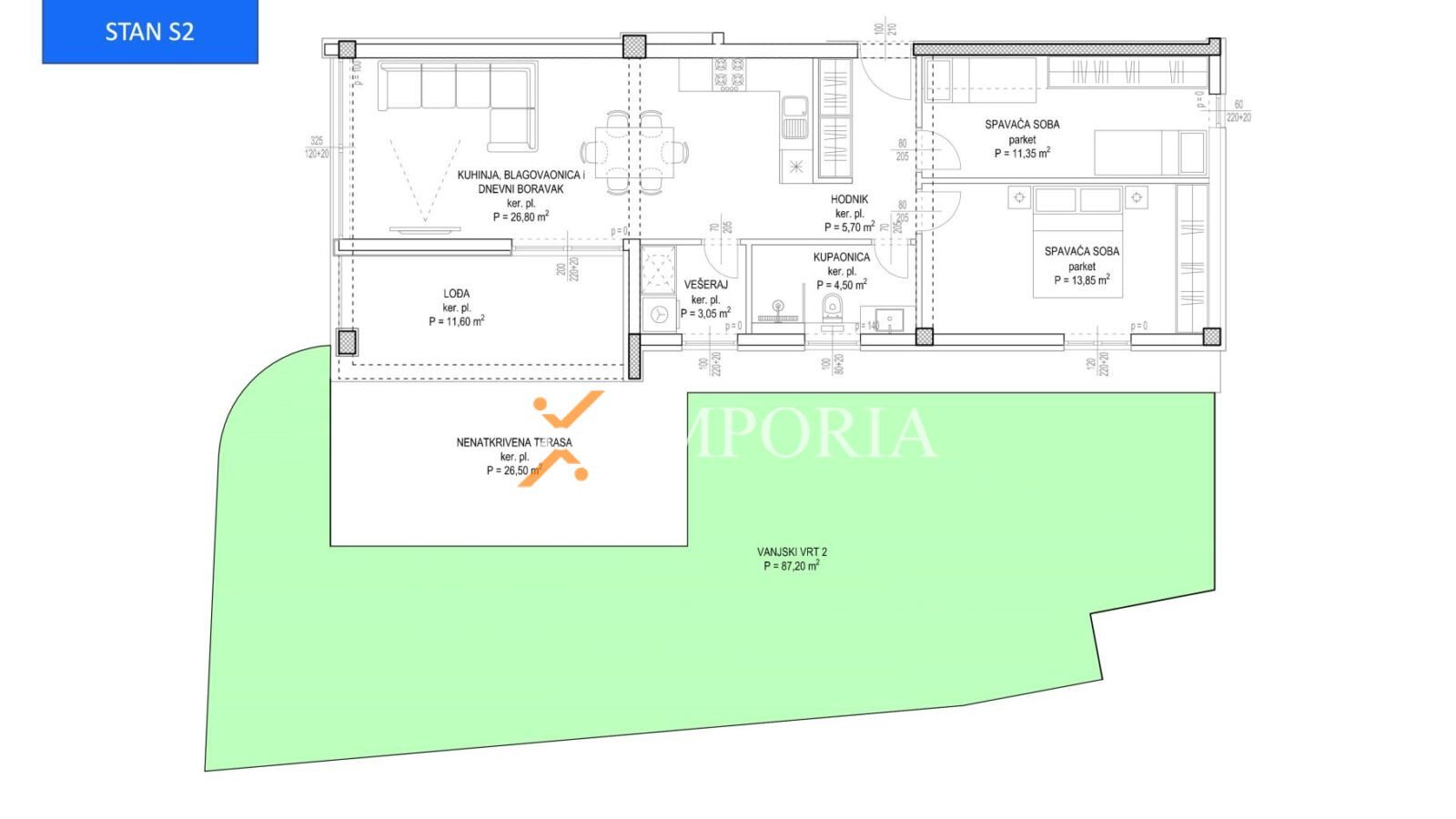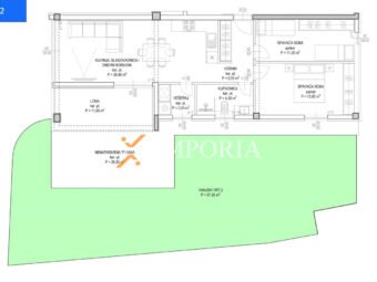 Ovo je stan u prizemlju zgrade. Raspored prostorija čine hodnik, 2 spavaće sobe, kupaonica, praonica, kuhinja s blagovaonicom i dnevnim boravkom te dijelom natkrivena terasa. Neto korisna površina opisanih prostorija iznosi 79,25 m2. Osim toga dodatno apartmanu pripadaju 2 parkirališna mjesta u garaži, vrt (87,20 m2) te spremište površine 3,50 m2 u podrumu.