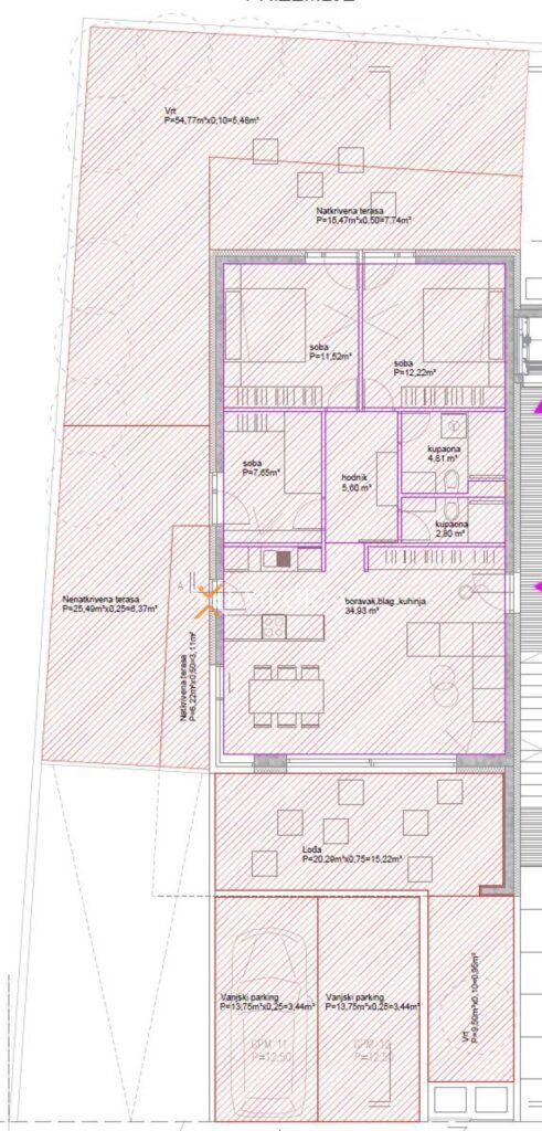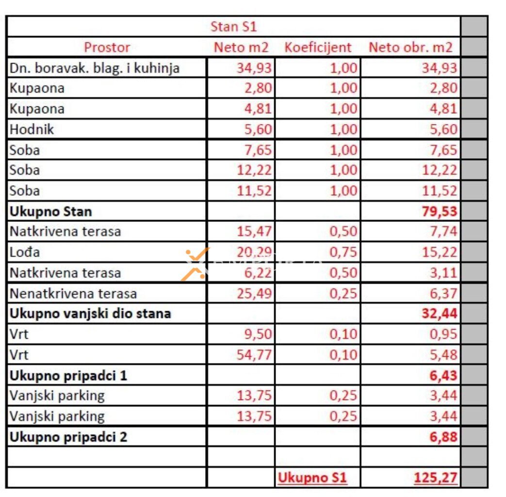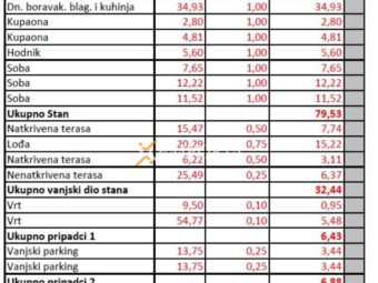 Dodatno stanu pripada vrt od 64,27 m2 i dva vanjska parkirališna mjesta. Ukupna neto površina s pripacima iznosi 125,27 m2.