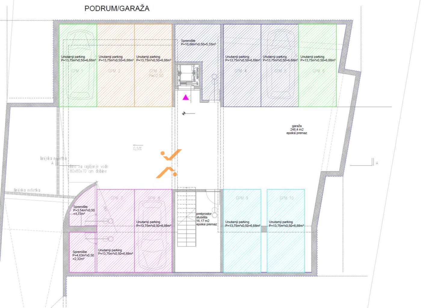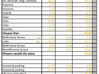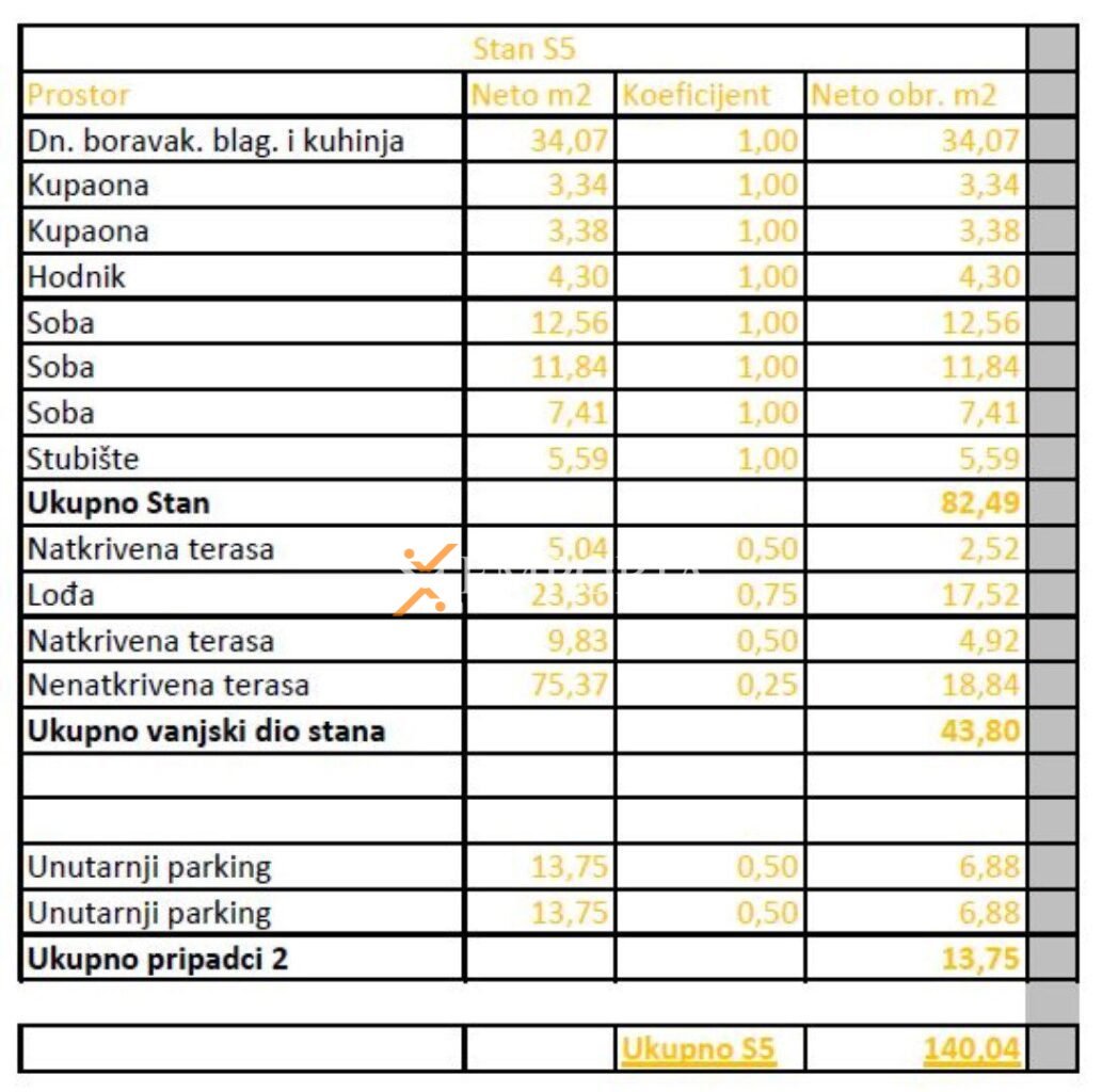 Dodatno stanu pripadaju dva garažna parkirališna mjesta. Ukupna neto površina s pripacima iznosi 140,04 m2.