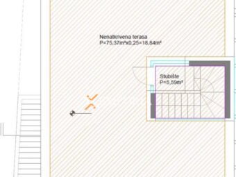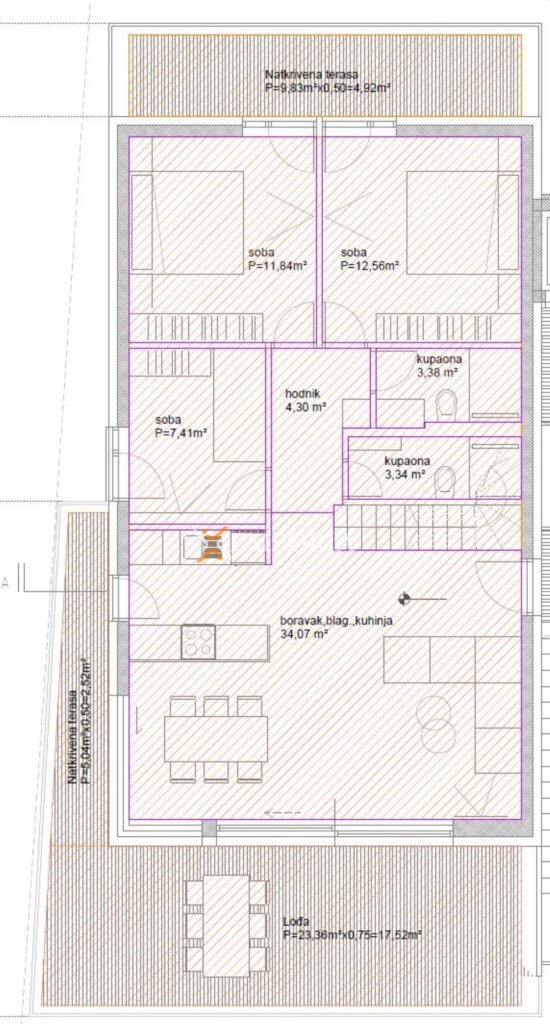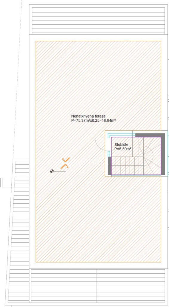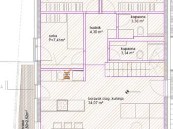 Ovo je stan na 2. katu zgrade. Raspored prostorija čine hodnik, dvije kupaonice, tri spavaće sobe, kuhinja s blagovaonicom i dnevnim boravkom, lođa te dvije natkrivene terase. Iz stana se stubištem ide na vlastitu krovnu terasu površine 75,37 m2. Neto korisna površina opisanih prostorija iznosi 126,29 m2.