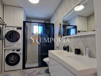 Gradnja zgrade izvršena je betonskim zidom i ciglenim termo blokom. Termoizolacija fasade je 10 cm stiropor. Prozori su od PVC materijala s troslojnim staklom, električnim roletama i komarnicima. Podne obloge su pločice. Postavljeni su klima uređaji u dnevnom boravku i u spavaćim sobama. Osim toga, u cijelom stanu je provedeno podno grijanje putem dizalice topline. Nadalje, ulazna vrata stana su protuprovalna i protupožarna.