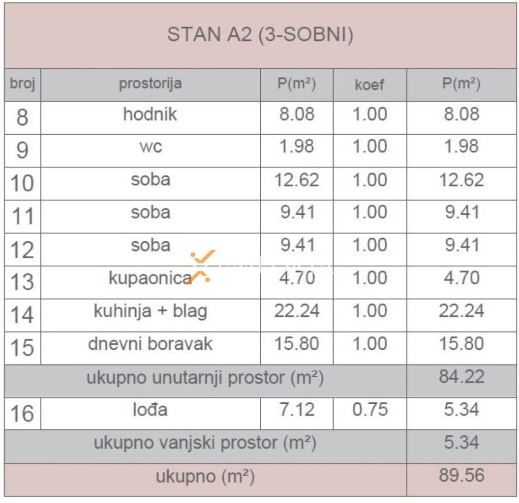 Raspored prostorija čine hodnik, tri spavaće sobe, kupaonica, WC, kuhinja s blagovaonicom i dnevnim boravkom te lođa. Neto korisna površina opisanih prostorija iznosi 89,56 m2.