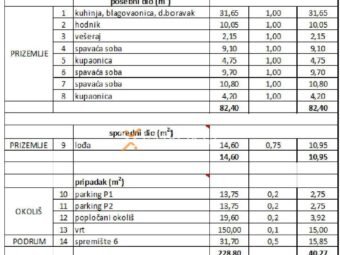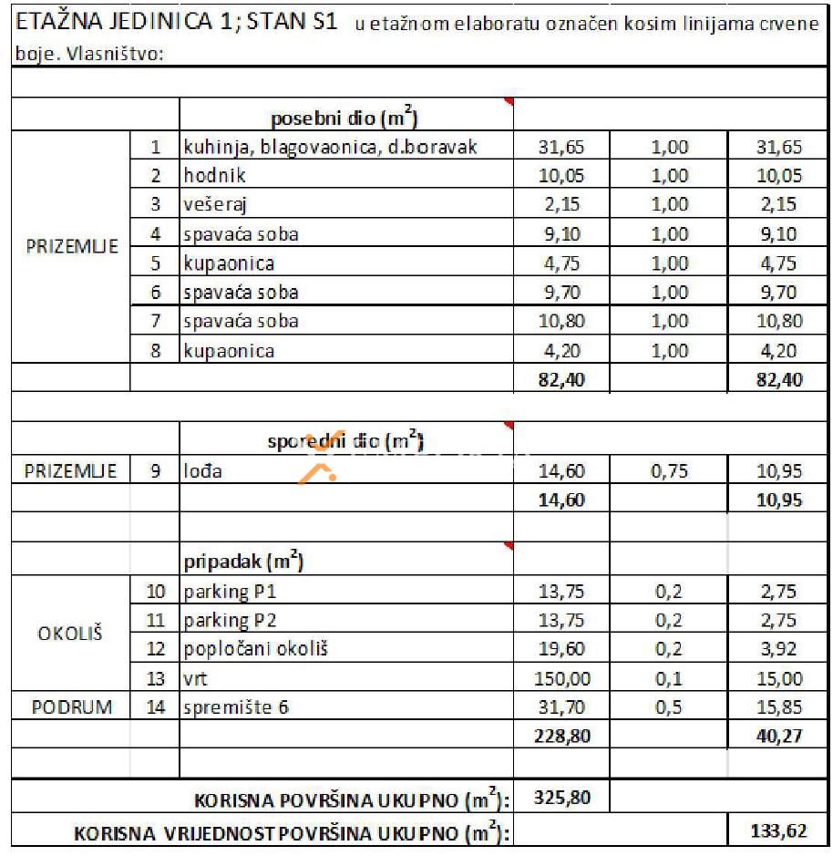 Stanu pripada veliki vrt površine 169,60 m² (od čega je 150 m² zeleni dio, a 19,60 m² popločani okoliš), dva parkirna mjesta te prostrano spremište u podrumu površine 31,70 m² (15,85 m² neto).