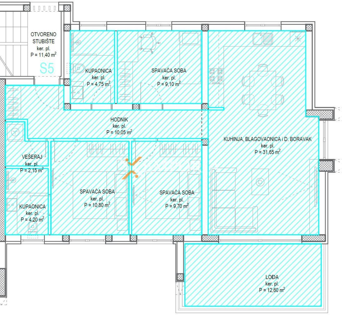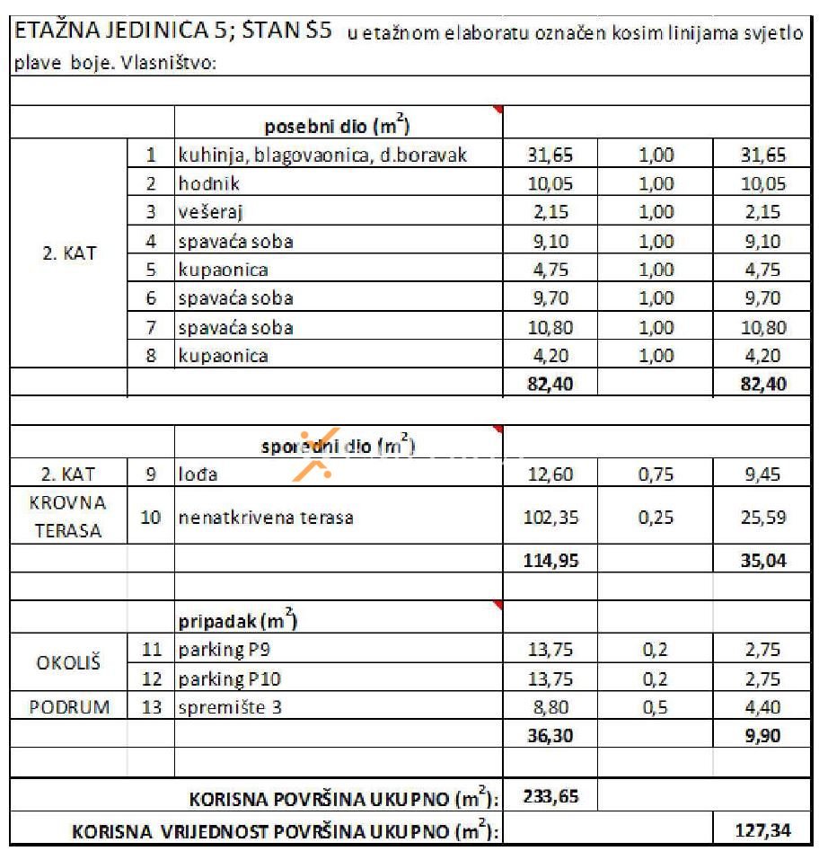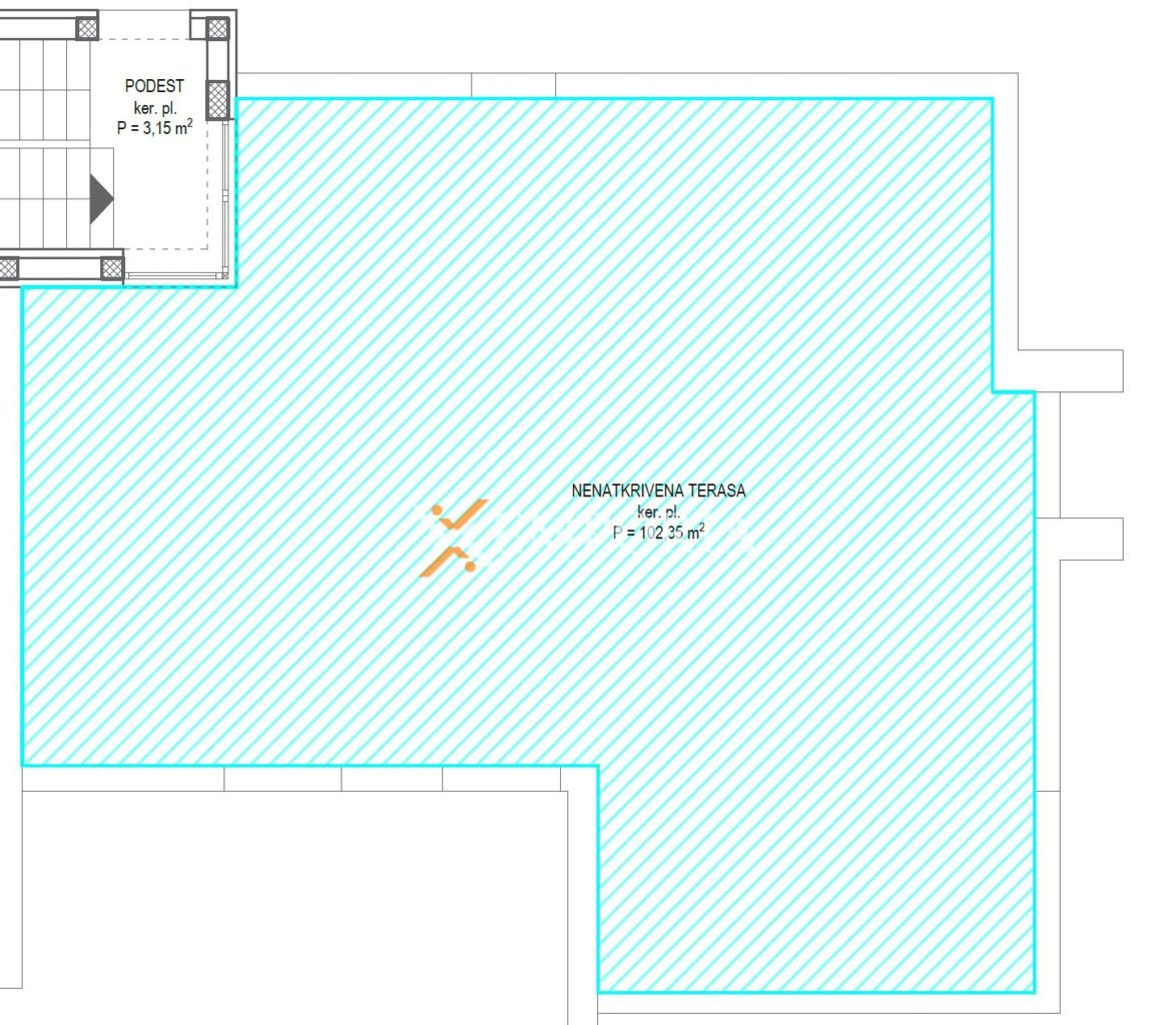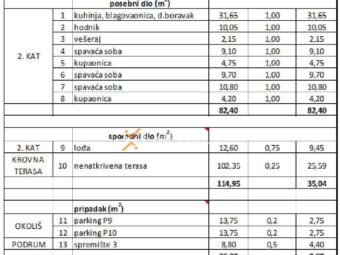Stan se sastoji od hodnika, dvije spavaće sobe, treće spavaće sobe s vlastitom kupaonicom, dodatne kupaonice, praonice te kuhinje s blagovaonicom i dnevnim boravkom. Iz dnevnog prostora izlazi se na lođu, dok se iz stubišta pristupa prostranoj krovnoj terasi površine 102,35 m² što ovu nekretninu čini idealnom za uživanje i opuštanje.