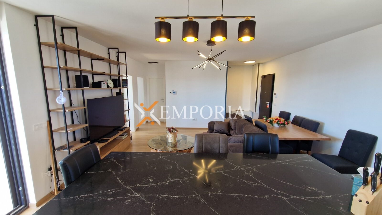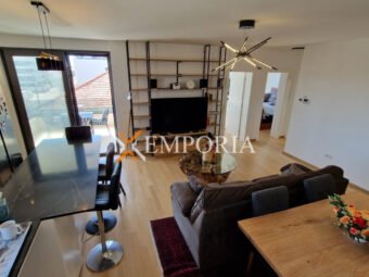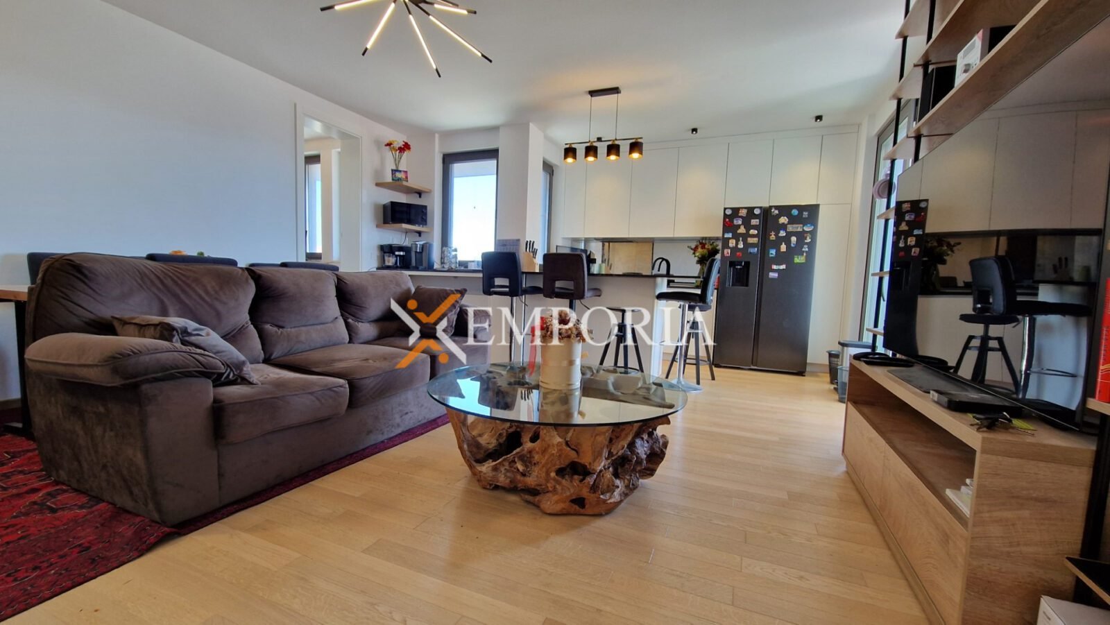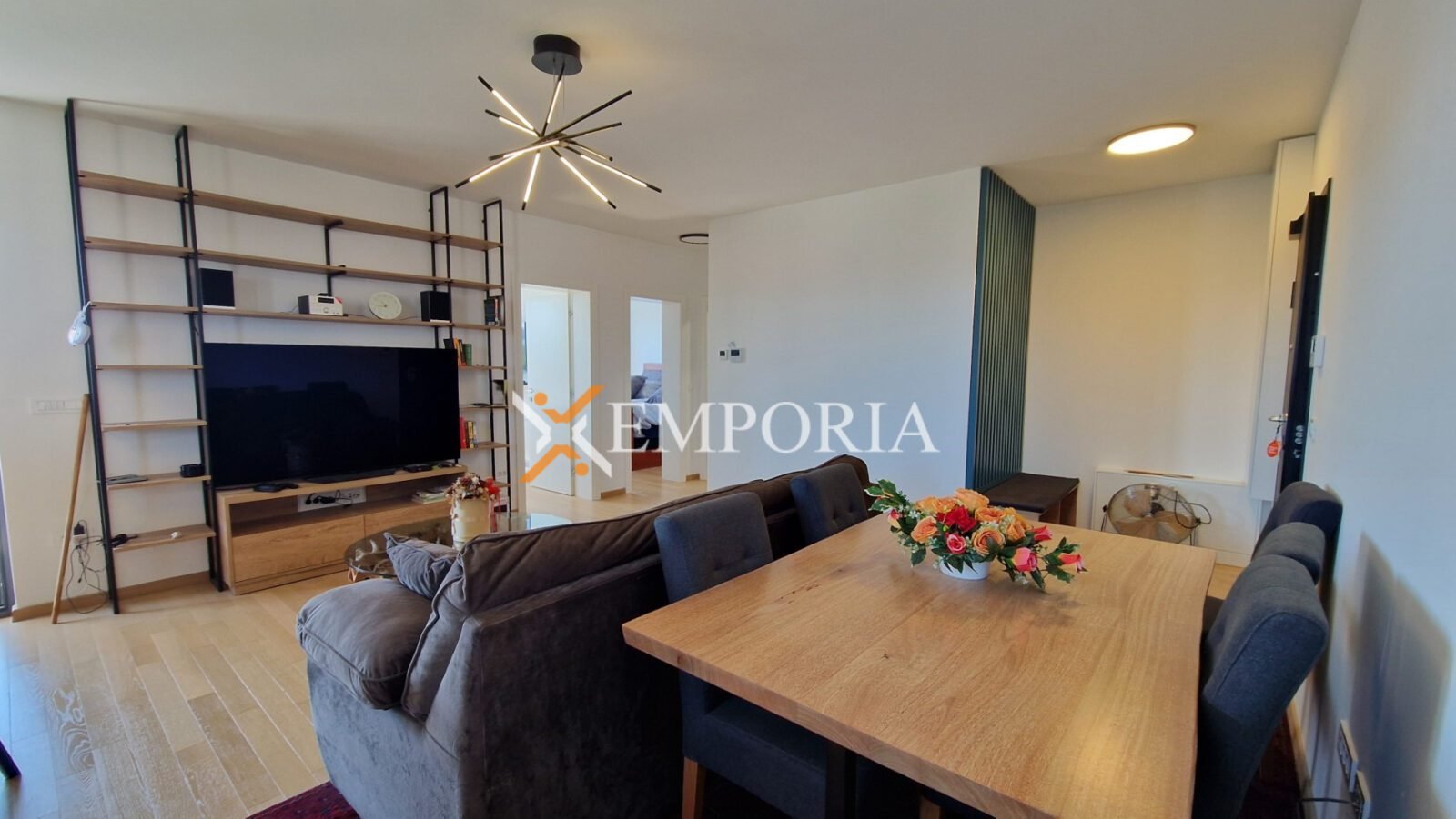 Stan se prodaje namješten. Ima podno grijanje u cijelom stanu putem dizalice topline, a grijanje i hlađenje omogućene su i putem tri klima jedinice (dnevni boravak + sobe). Stolarija je aluminijska s troslojnim staklom, električnim roletama i komarnicima. Ulazna vrata su protuprovalna i protupožarna. Podovi su obloženi pločicama i parketom, a fasada zgrade izolirana je stiroporom debljine 10 cm.