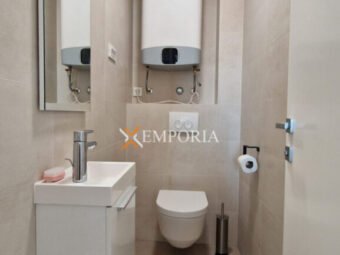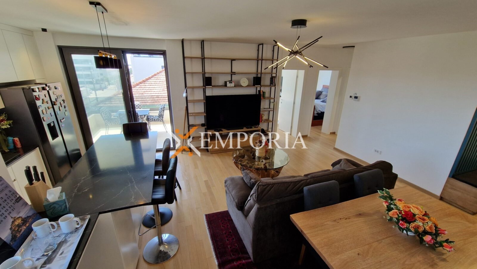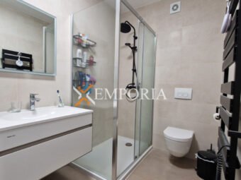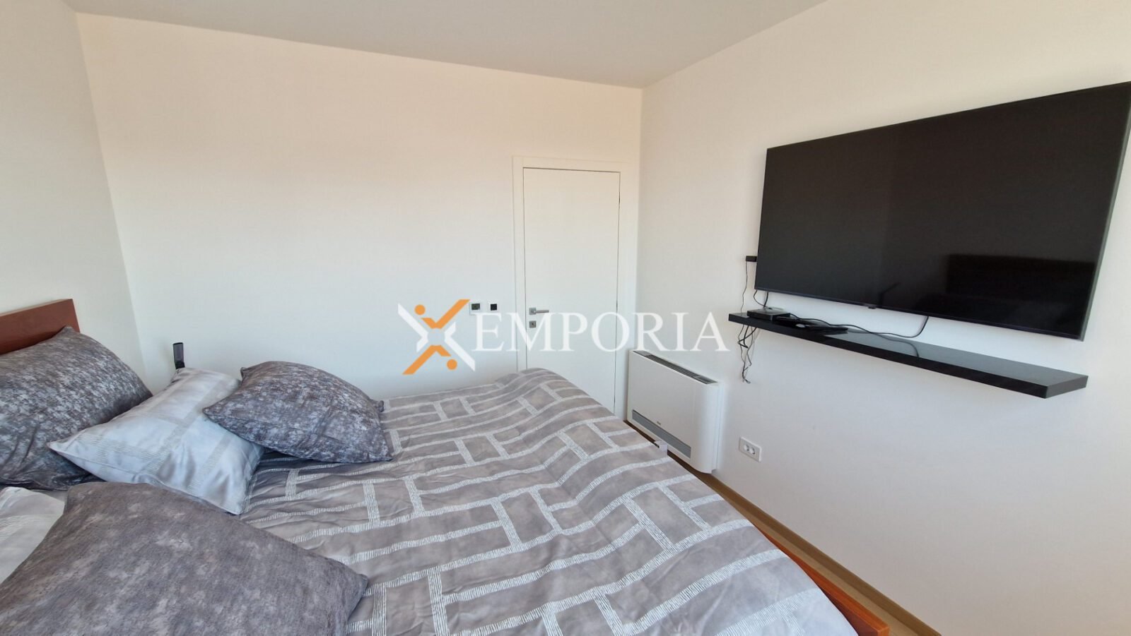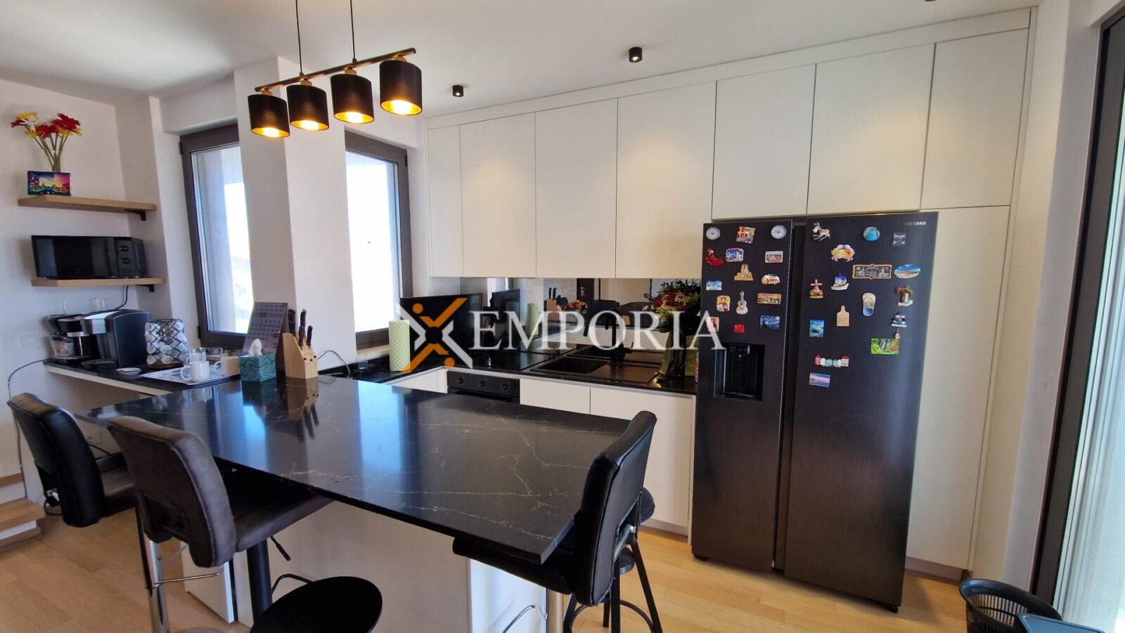 Stan se prodaje namješten. Ima podno grijanje u cijelom stanu putem dizalice topline, a grijanje i hlađenje omogućene su i putem tri klima jedinice (dnevni boravak + sobe). Stolarija je aluminijska s troslojnim staklom, električnim roletama i komarnicima. Ulazna vrata su protuprovalna i protupožarna. Podovi su obloženi pločicama i parketom, a fasada zgrade izolirana je stiroporom debljine 10 cm.