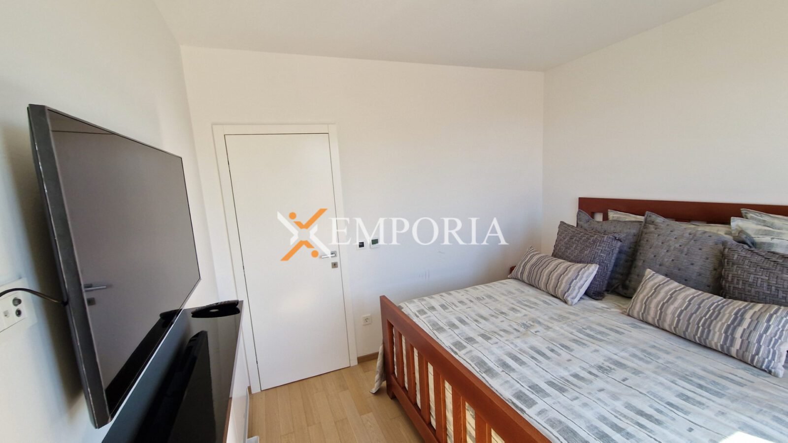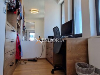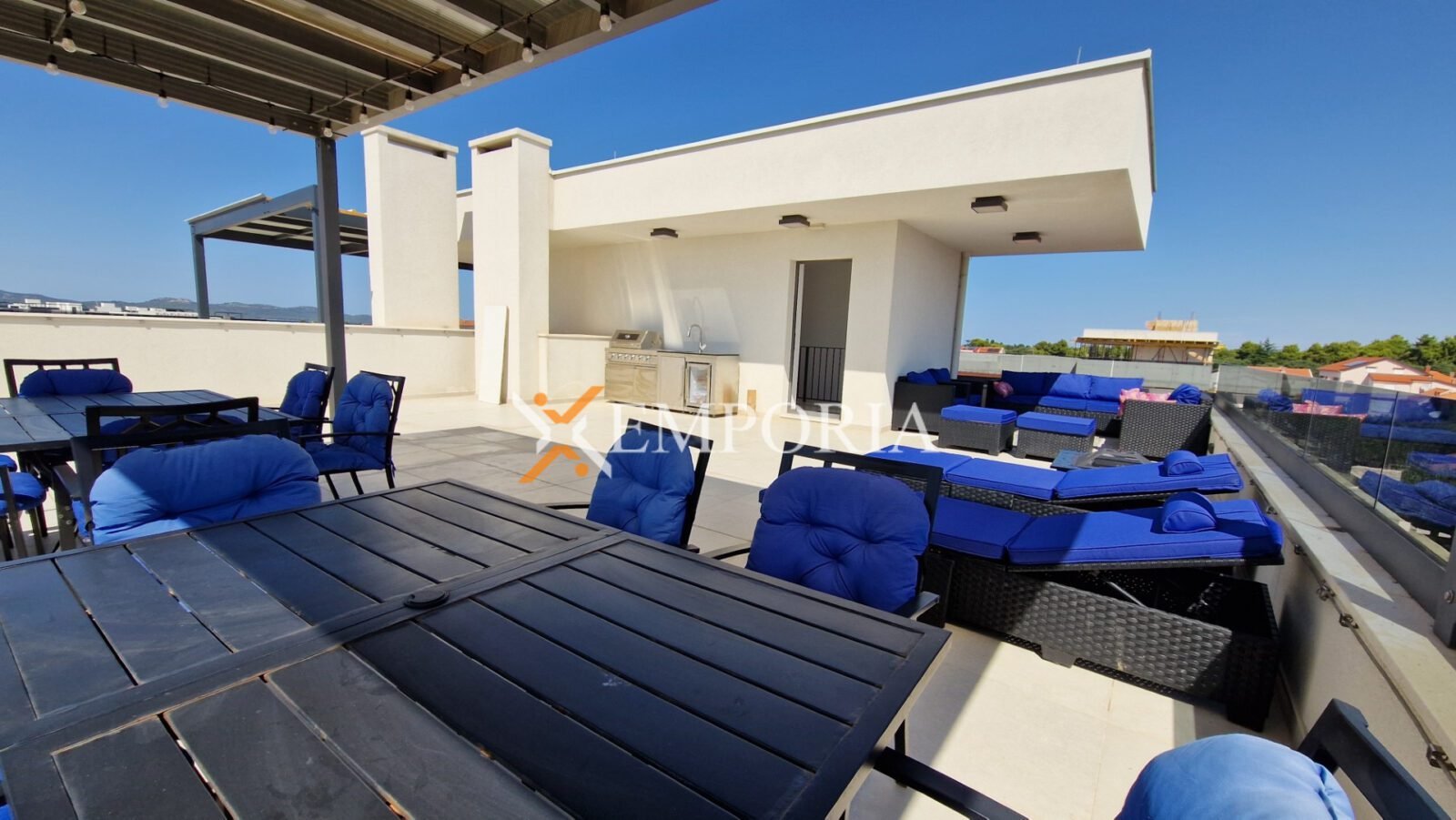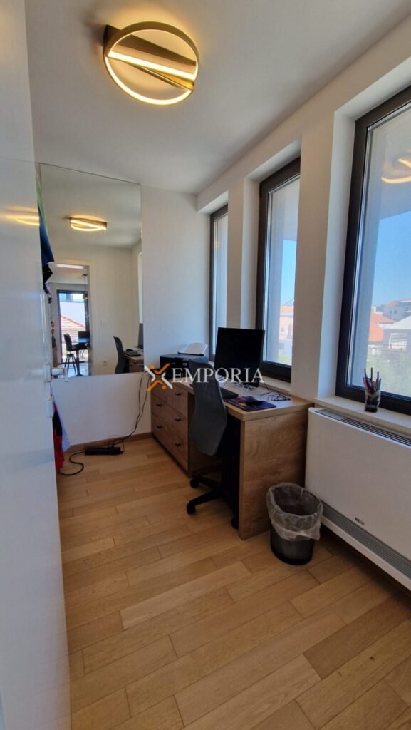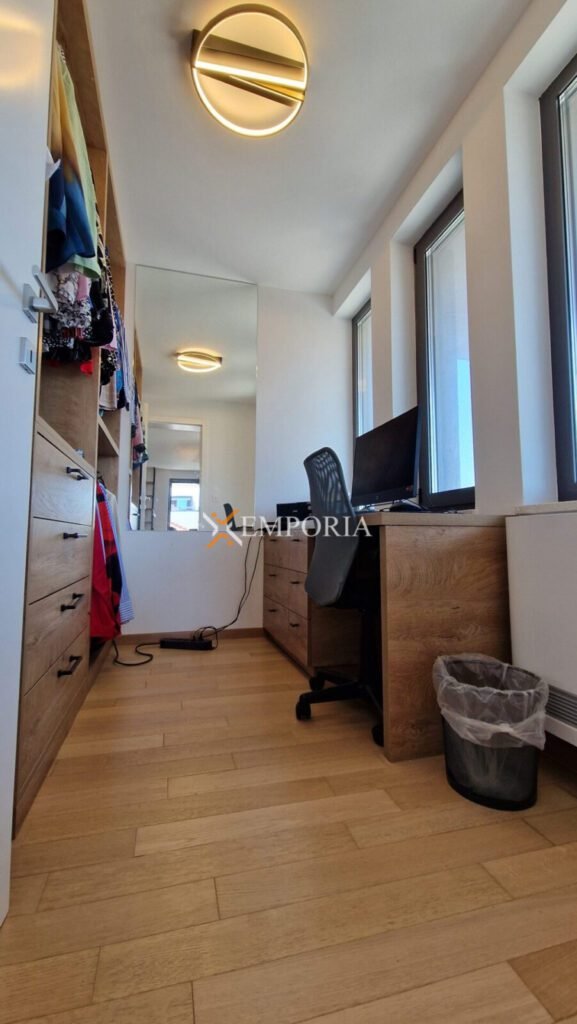 Stan se sastoji od hodnika, dvije spavaće sobe, radne sobe, kupaonice, zasebnog WC-a, kuhinje s blagovaonicom i dnevnim boravkom te natkrivene terase. Iz stubišta se pristupa prostranoj krovnoj terasi površine 85,88 m², koja je dijelom natkrivena i pruža djelomičan pogled na more – savršena za opuštanje i druženje.
