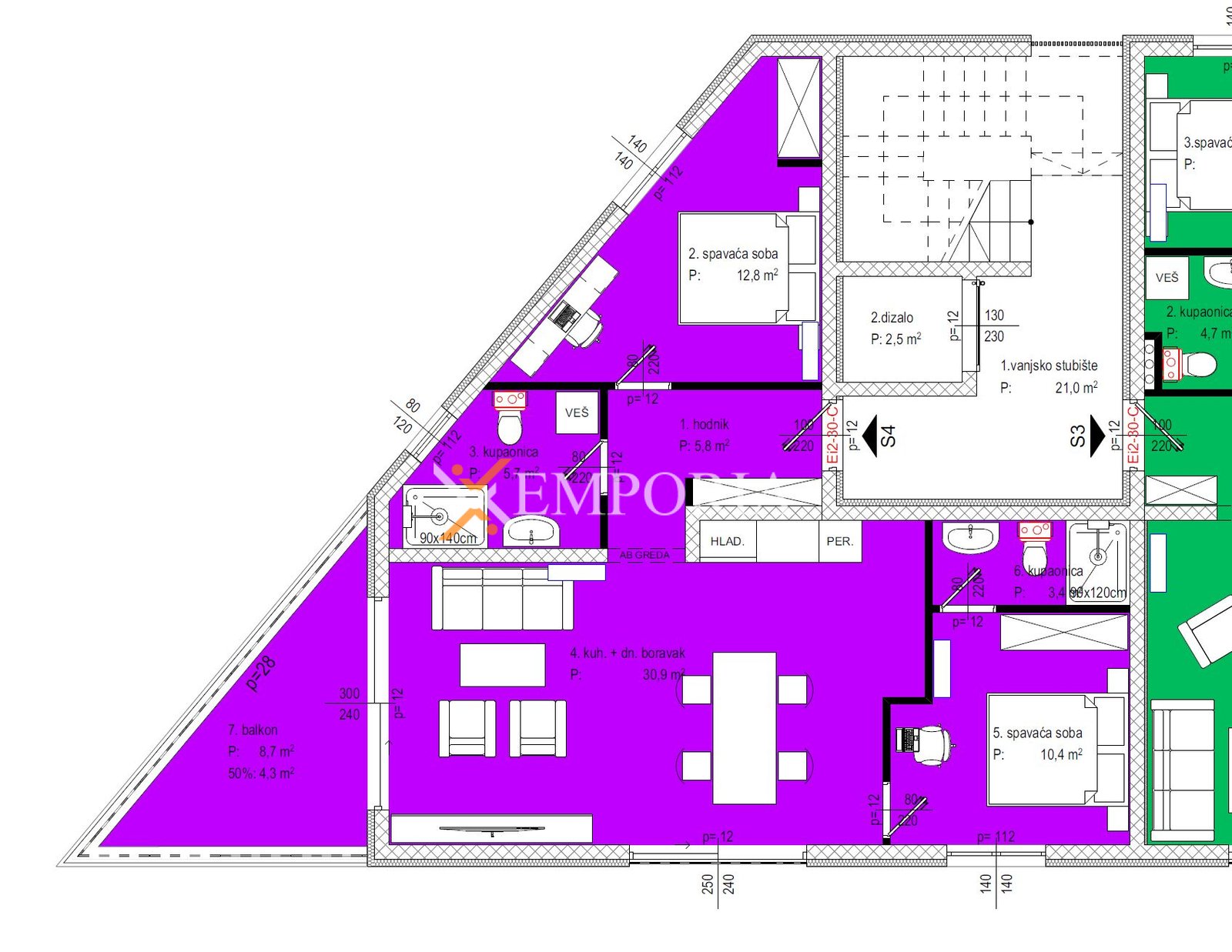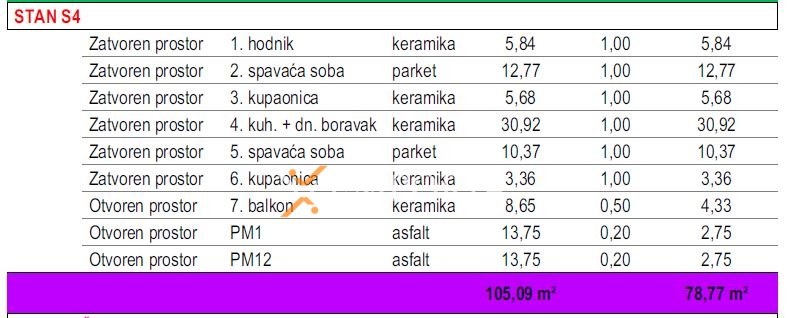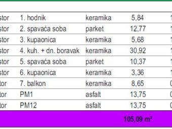 Stan se sastoji od hodnika, kuhinje s blagovaonicom i dnevnim boravkom, spavaće sobe s vlastitom kupaonicom, dodatne spavaće sobe, još jedne kupaonice te terase. Neto korisna površina stana iznosi 73,27 m², dok ukupna površina s pripacima iznosi 78,77 m². Stanu pripadaju dva parkirna mjesta.