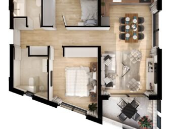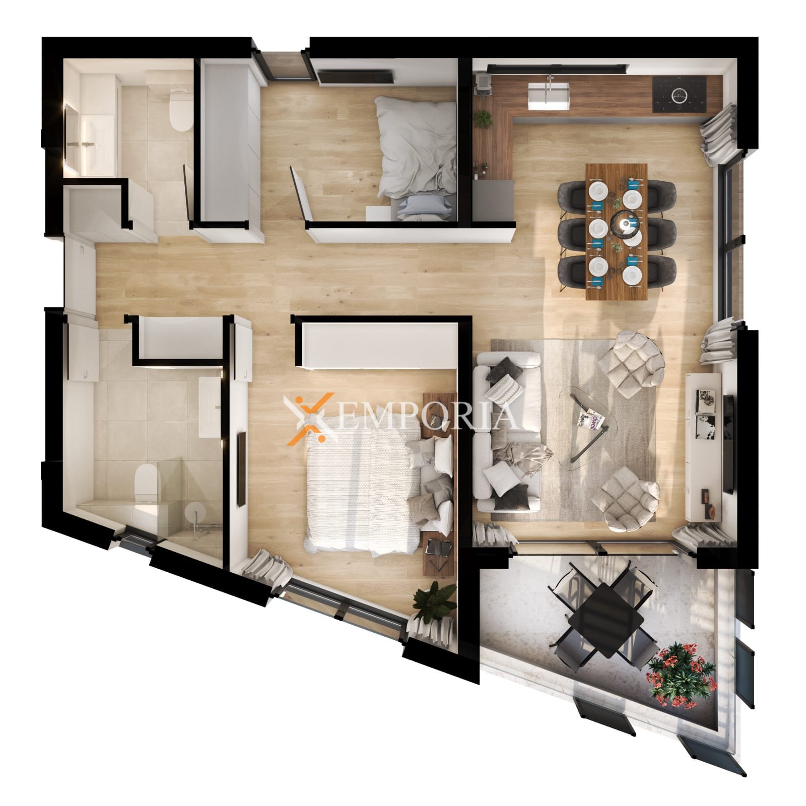 Raspored prostorija čine hodnik, dvije spavaće sobe, dvije kupaonice, kuhinja s blagovaonicom i dnevnim boravkom te lođa. Neto korisna površina stana iznosi 67,94 m².