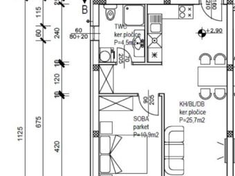 Stan se nalazi na prvom katu i ima ukupnu neto površinu od 61,84 m², uključujući pripatke. Sastoji se od spavaće sobe, kupaonice, kuhinje s blagovaonicom i dnevnim boravkom te lođe koja nudi ugodan prostor za opuštanje. Zbog pažljivo osmišljenog rasporeda prostorija i južne orijentacije, stan je svijetao i prozračan tijekom cijelog dana, što ga čini idealnim za ugodan svakodnevni život ili kao investiciju za turistički najam.