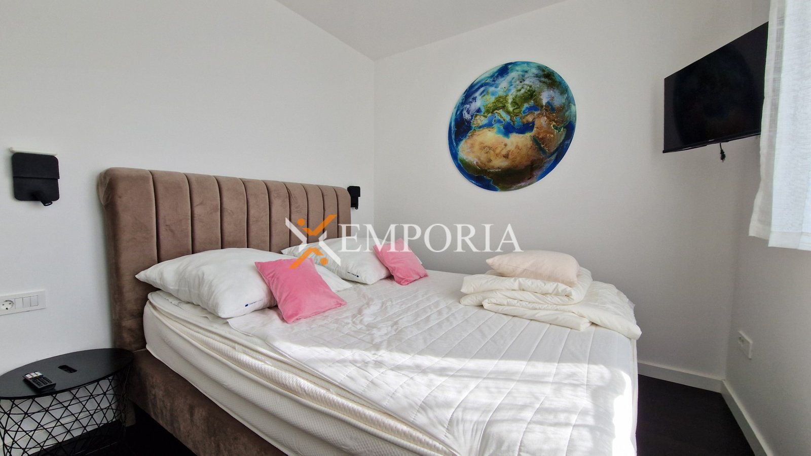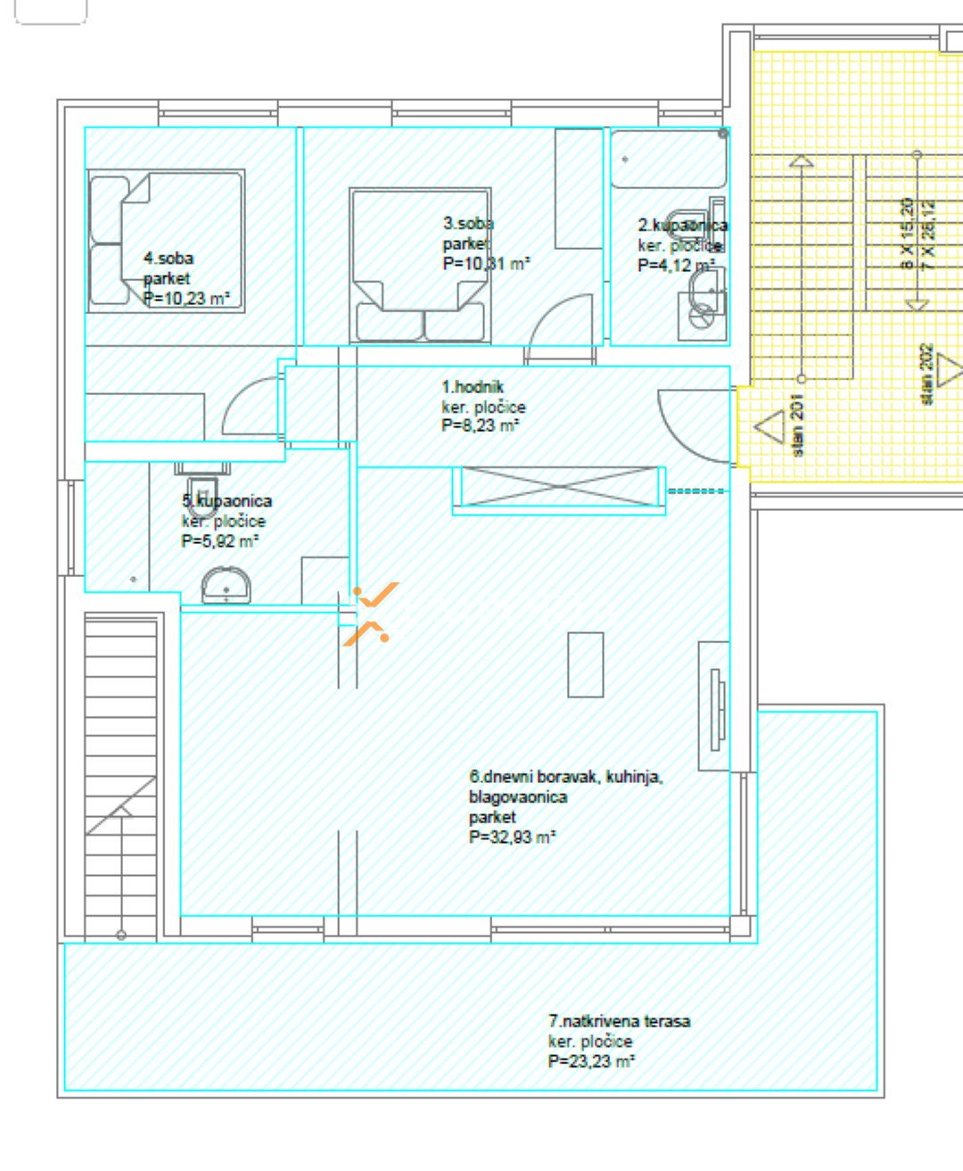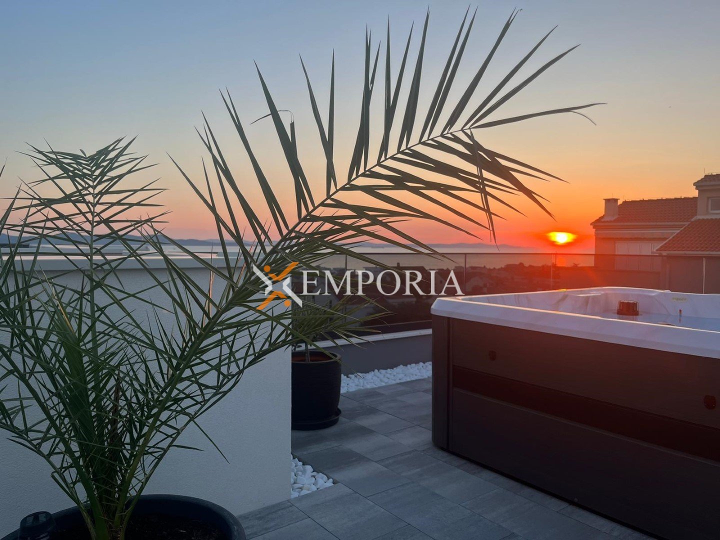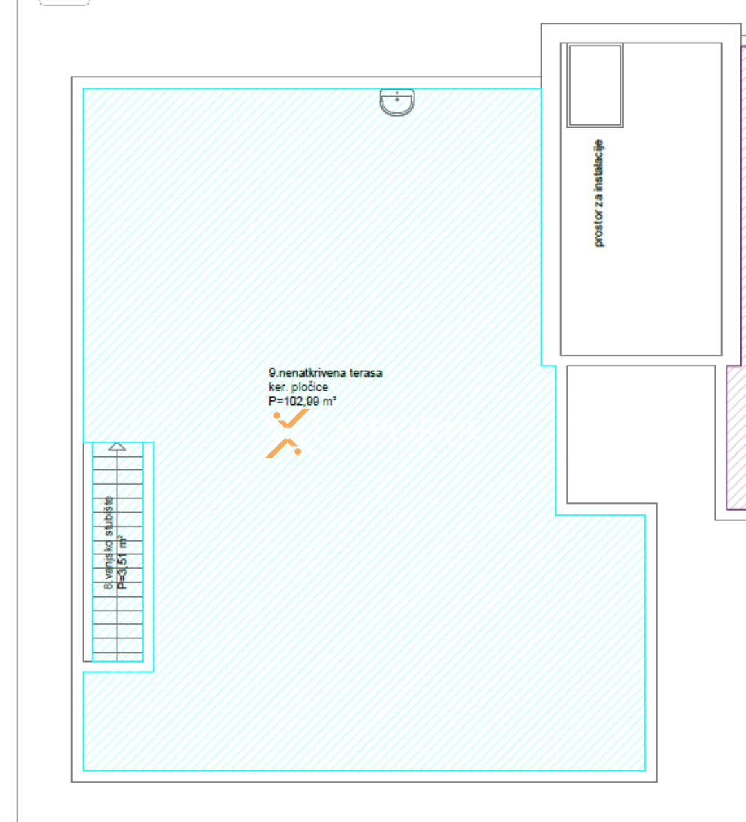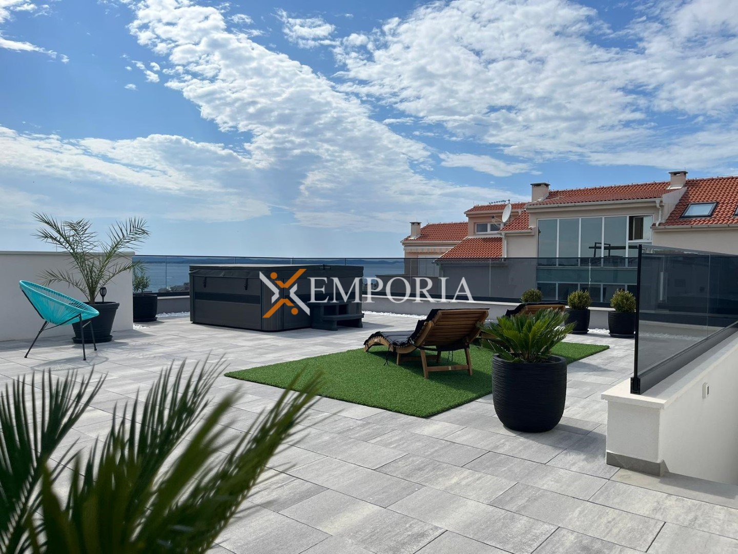 Raspored prostorija čine hodnik, spavaća soba, spavaća soba s vlastitom kupaonicom, dodatna kupaonica, kuhinja s blagovaonicom i dnevnim boravkom te natkrivena terasa površine 75,12 m². S terase se pristupa na prostranu krovnu terasu od 102,99 m², koja pruža izvrstan prostor za opuštanje na otvorenom. Na krovnoj terasi nalazi se i jacuzzi.