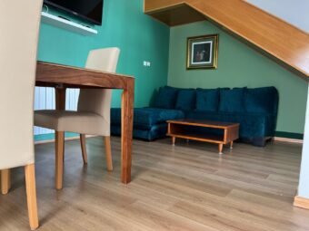 Stan se prostire na prvom i drugom katu. Na prvoj etaži nalazi se natkrivena terasa ispred samog ulaza u stan, WC, kuhinja s blagovaonicom i dnevnim boravkom u otvorenom konceptu, dodatna natkrivena terasa te spavaća soba s vlastitom natkrivenom terasom. Unutarnje stepenice vode na gornju etažu gdje su smještene dvije spavaće sobe, kupaonica te natkrivena terasa, kao i dodatna spavaća soba s pripadajućom natkrivenom terasom.
