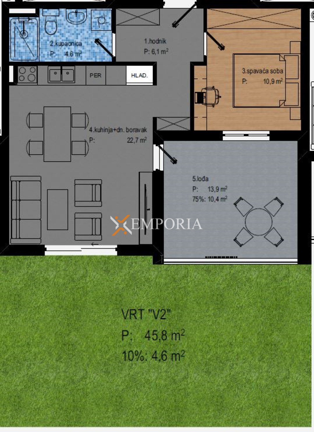 Raspored prostorija čine hodnik, spavaća soba, kupaonica, kuhinja s blagovaonicom i dnevnim boravkom otvorenog koncepta te lođa. Neto korisna površina opisanih prostorija iznosi 54,74 m2. Stanu dodatno pripada privatni vrt površine 45,84 m2, koji pruža dodatni komfor i prostor za boravak na otvorenom.