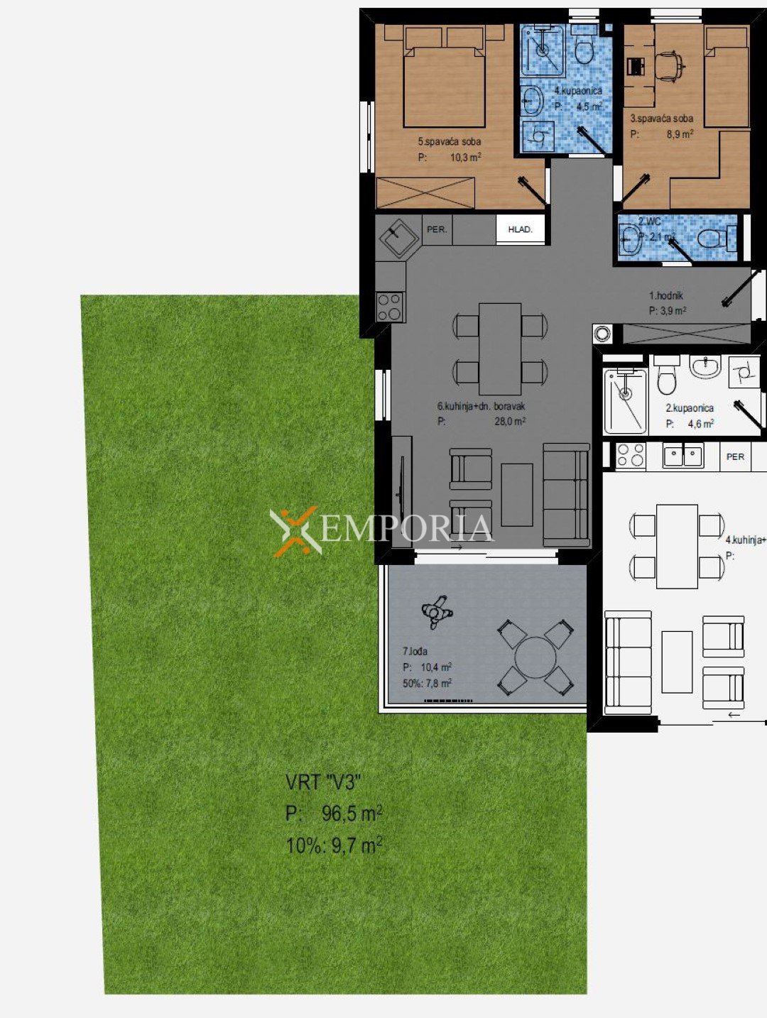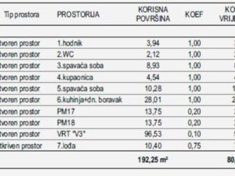 Raspored prostorija čine hodnik, dvije spavaće sobe, kupaonica, zaseban wc, kuhinja s blagovaonicom i dnevnim boravkom otvorenog koncepta te lođa. Neto korisna površina opisanih prostorija iznosi 65,76 m2. Stanu dodatno pripada prostrani privatni vrt površine 96,53 m2, koji pruža izniman komfor i dodatni prostor za opuštanje, dječju igru ili druženja na otvorenom.