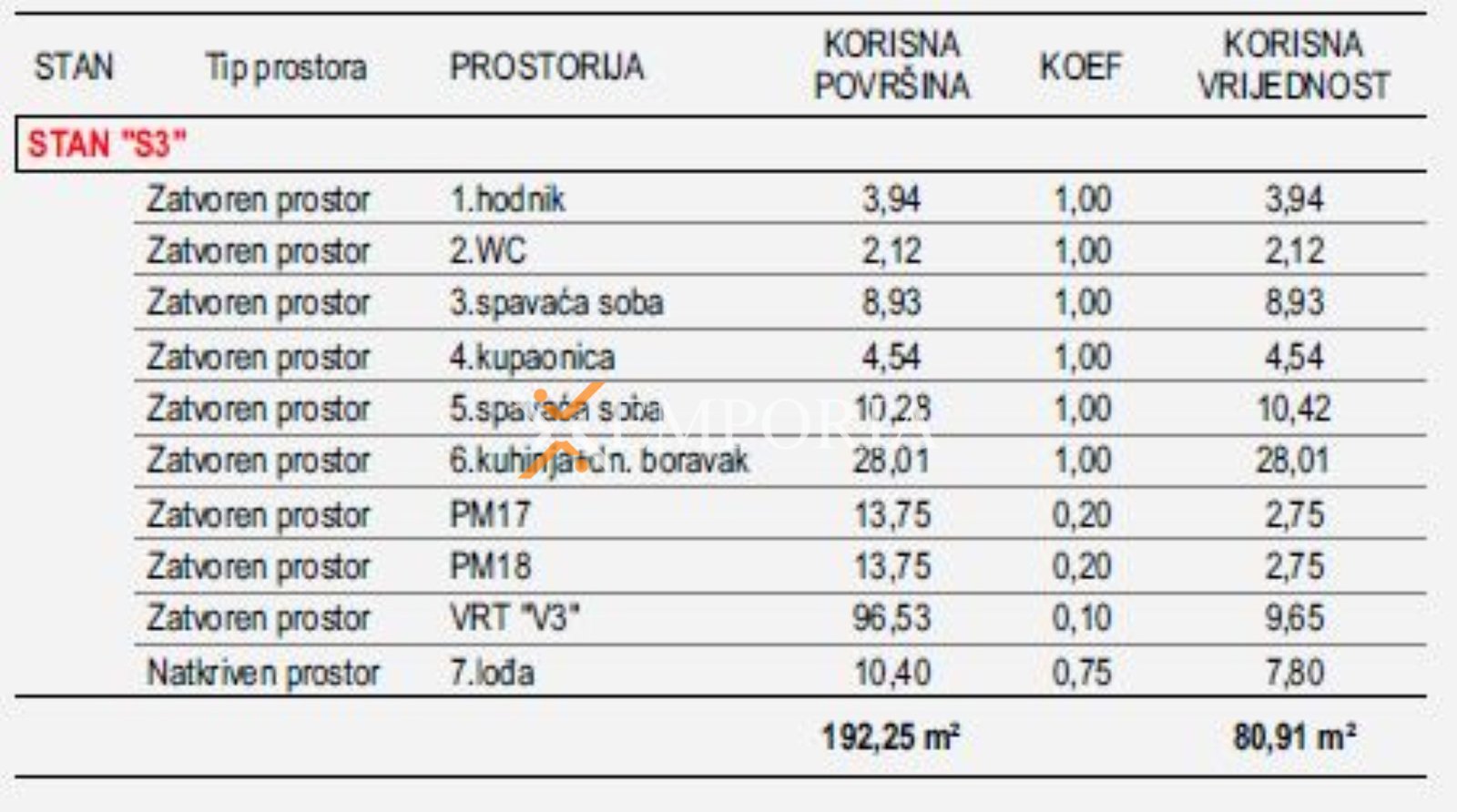 Ukupna neto površina s pripacima iznosi 80,91 m2. Nekretnini pripadaju dva parkirna mjesta, što predstavlja veliku prednost na gradskoj lokaciji.