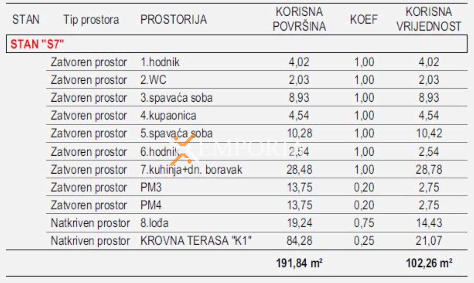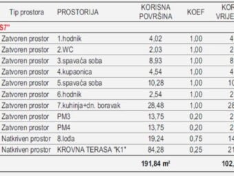 Neto korisna površina opisanih prostorija iznosi 96,76 m2, dok ukupna neto površina s pripacima iznosi 102,26 m2. Stanu pripadaju dva parkirna mjesta, što predstavlja značajnu prednost na ovoj gradskoj lokaciji.