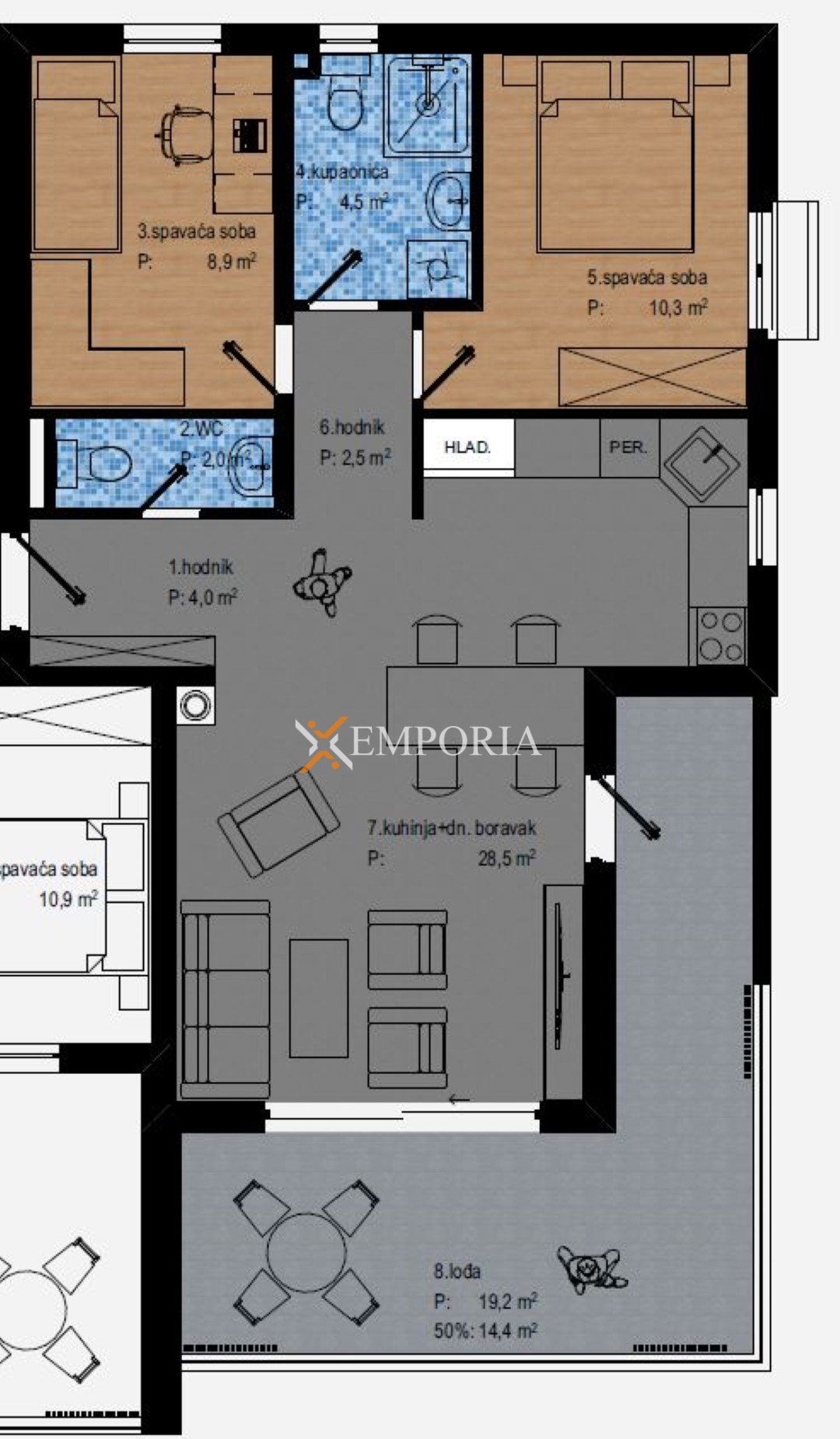 Raspored prostorija čine hodnik, dvije spavaće sobe, kupaonica, zaseban wc, kuhinja s blagovaonicom i dnevnim boravkom otvorenog koncepta te lođa, ukupne neto površine 75,69 m2. Iz stubišta se pristupa privatnoj krovnoj terasi površine 84,28 m2, koja pruža dodatni prostor za opuštanje i druženje na otvorenom.