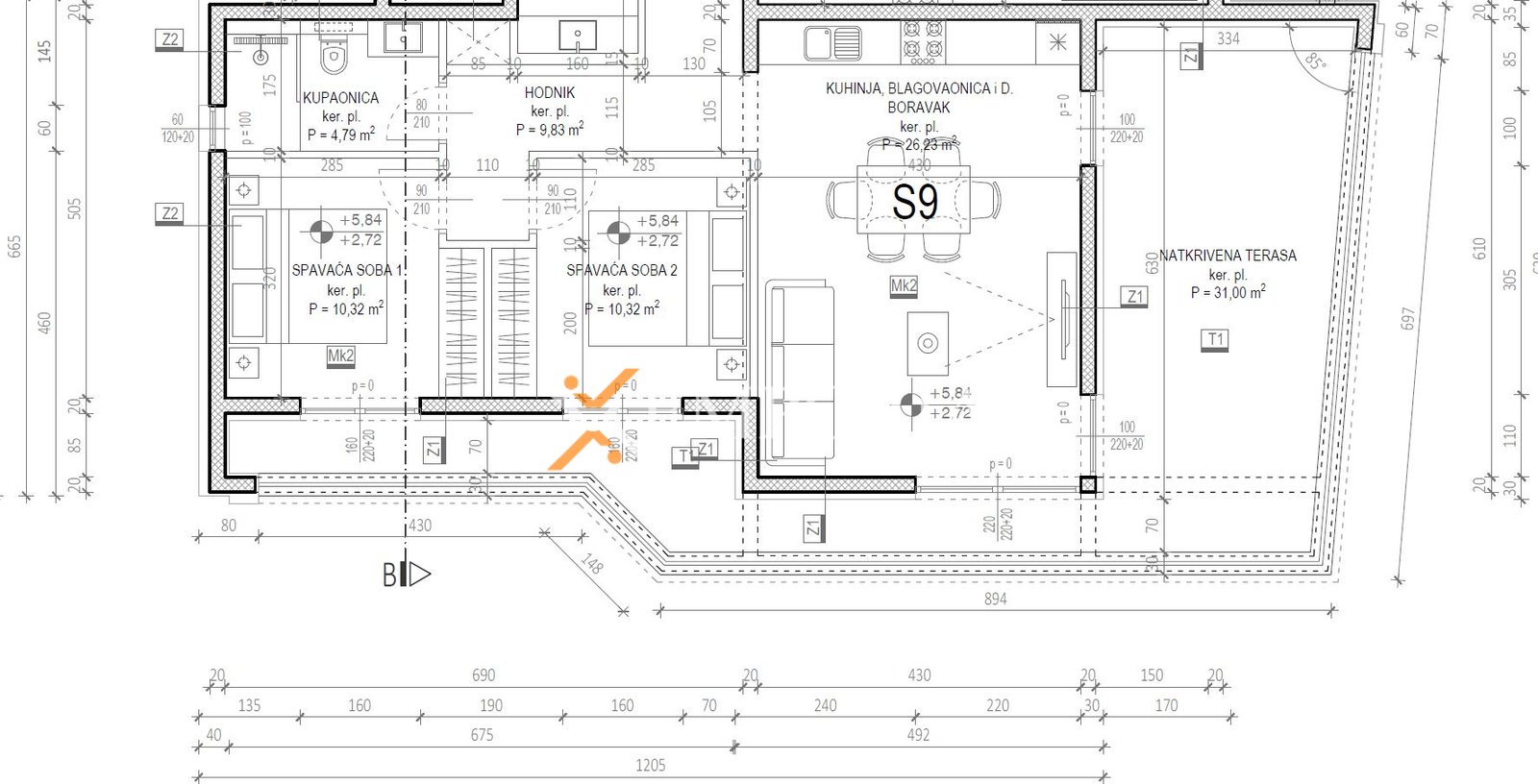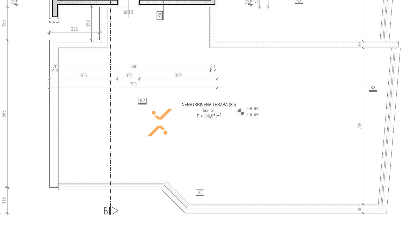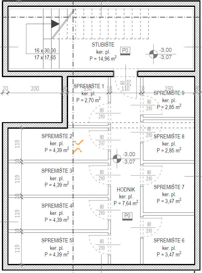 Stan se sastoji od hodnika, 2 spavaće sobe, praonice/WC-a, kupaonice, kuhinje s blagovaonicom i dnevnim boravkom te lođe (80,57 m2 neto), a iz stubišta se ide na krovnu terasu površine 106,57 m2. Neto korisna površina opisanih prostorija iznosi 107,21 m2. Dodatno, stanu pripadaju 2 parkirna mjesta i spremište u podrumu.